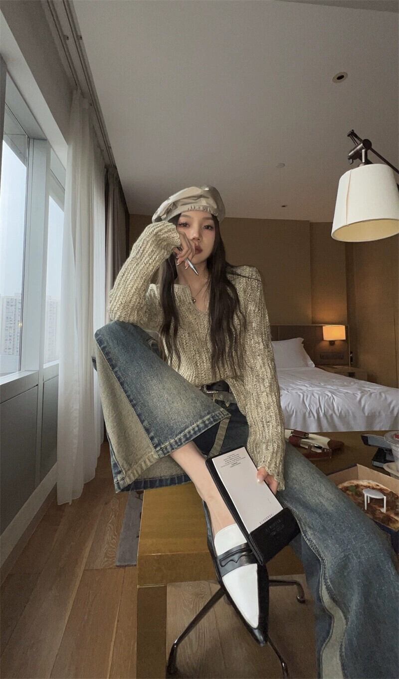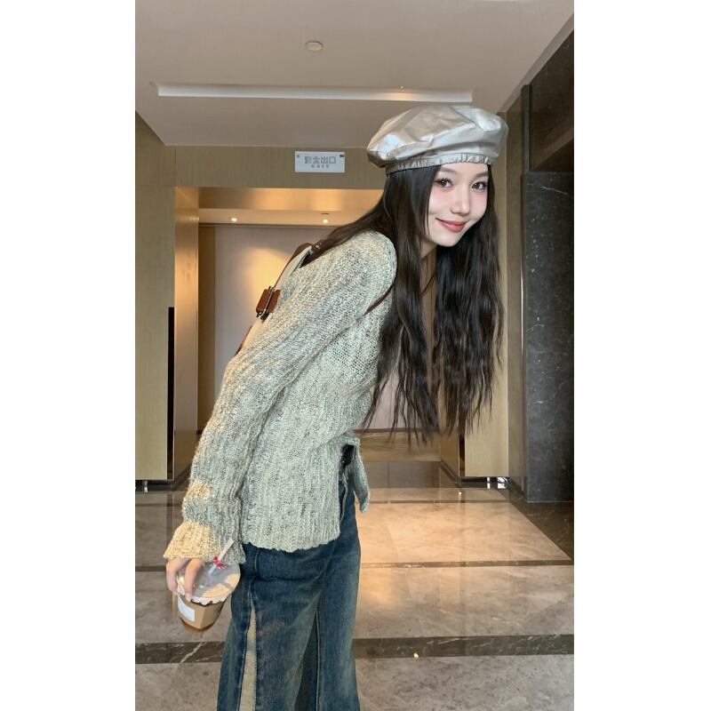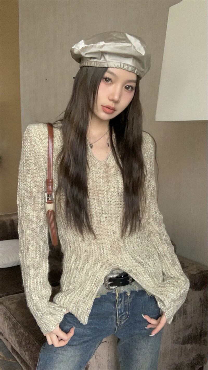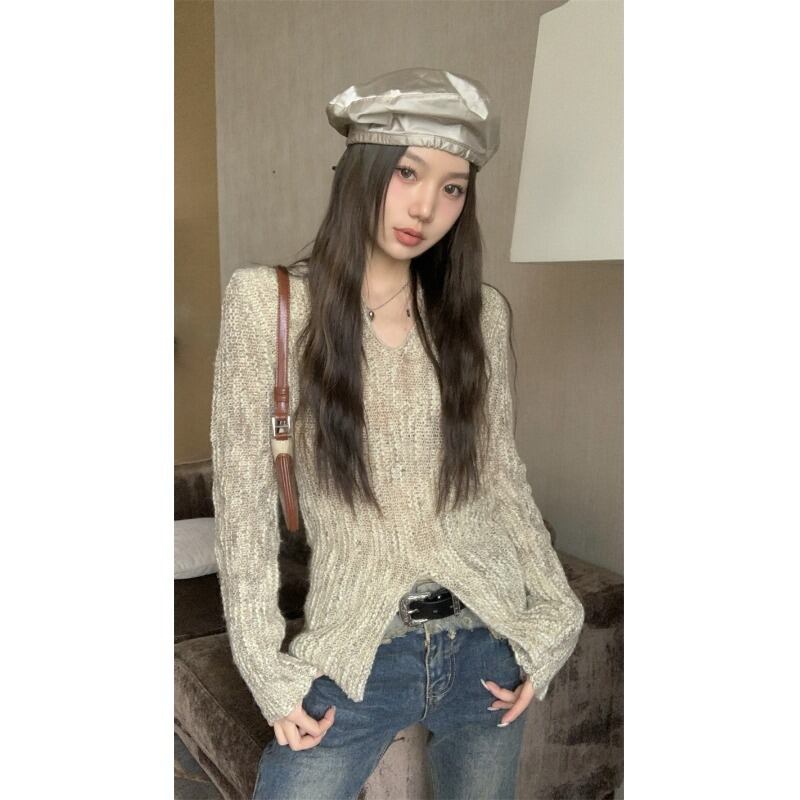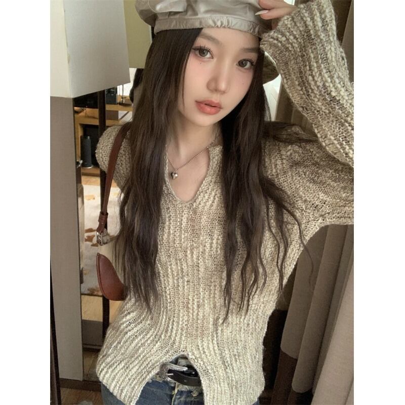 バージョン中空 V ネック長袖プルオーバー セーター レディース 2023 春の新作オールマッチ スリット スリム スリム トップ イン ロング スプリング 春物 Vネック 0921936046535184