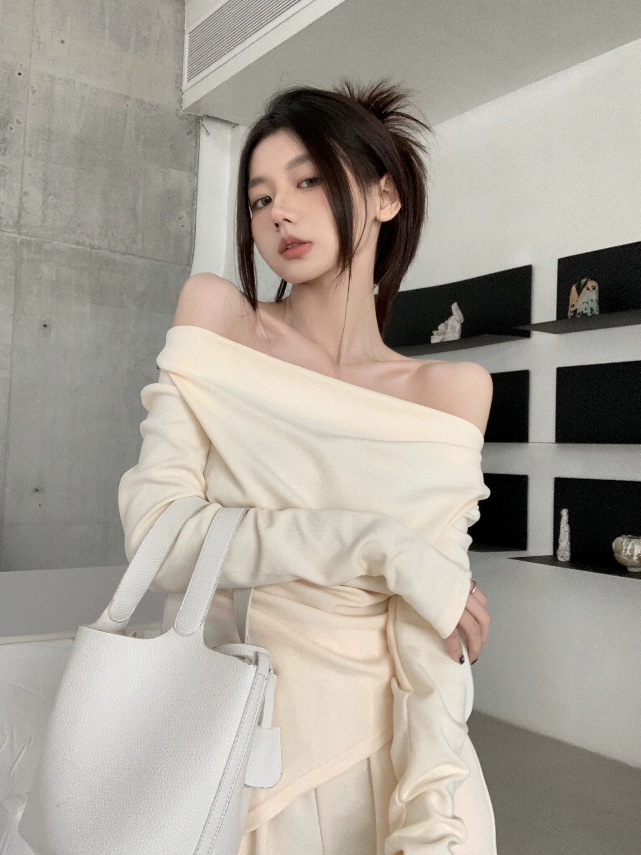 怠惰なスタイルのファッションスーツ女性 2023 春の新しいワンショルダー長袖トップカジュアルパンツ 2 点セット ロング スプリング 春物 0921913468927237