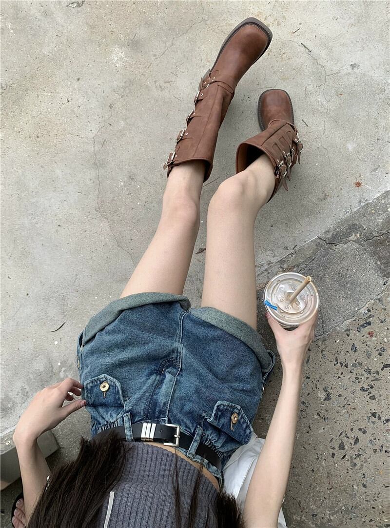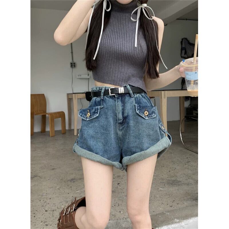 ウエストゆるくて細いベルト付きジーンズレディース2023年夏新デザインAラインワイドレッグショーツ サマー 夏物 ハーネス ブルマー 0921947264155899