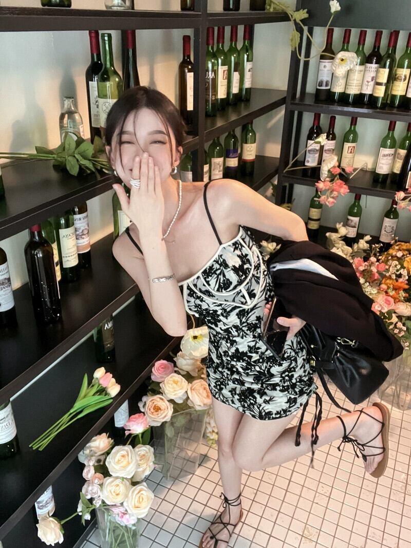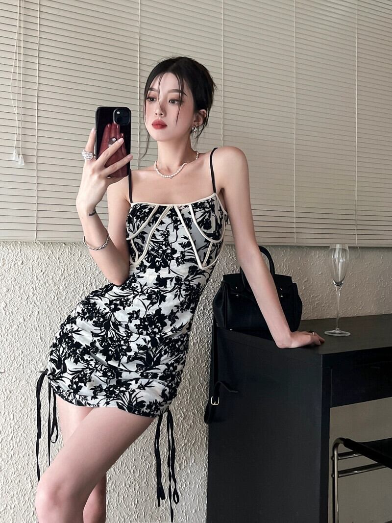 レトロプリントサスペンダードレス女性の夏 2023 新しい巾着ウエスト痩身セクシーなパッケージヒップスカート サマー 夏物 0921953764471915