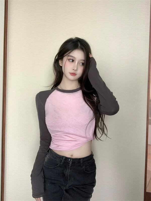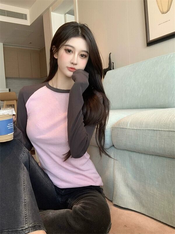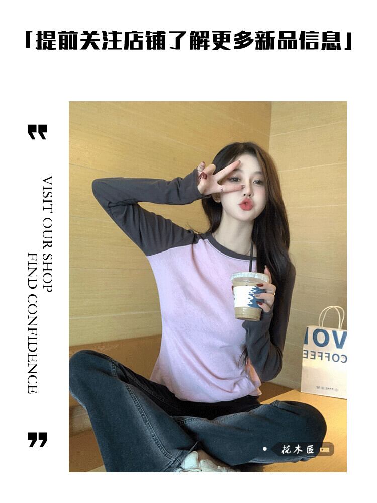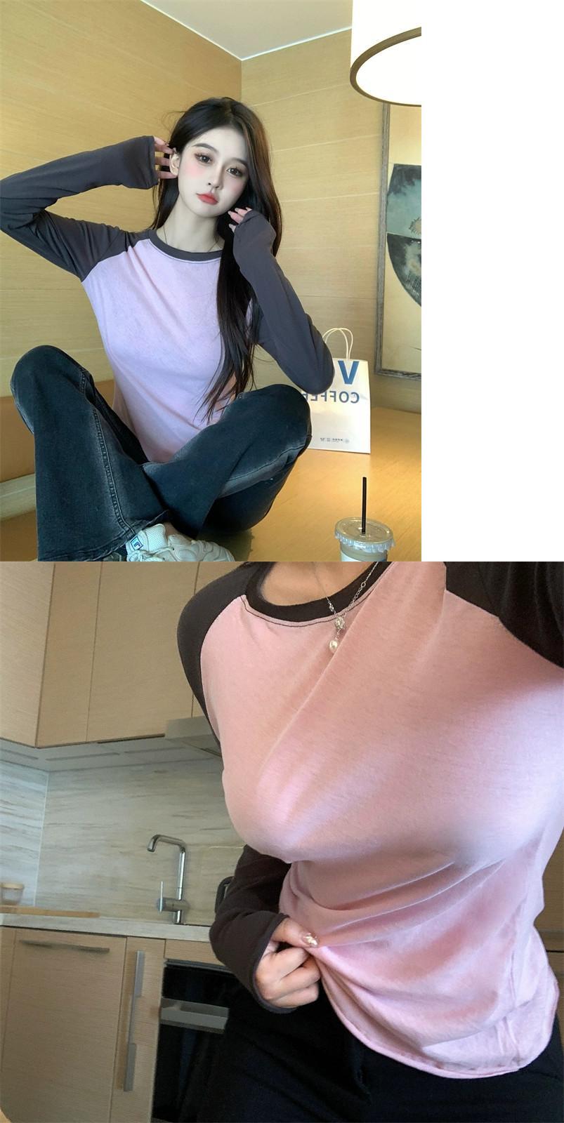 バージョンのカラーブロッキングオールマッチラウンドネック長袖Tシャツレディース2023年春の新作スリムフィットと薄手のインナーボトムシャツトップ ロング スプリング 春物 Oネック 0921938635204595