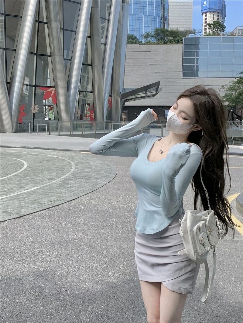 色:ウォーターブルーのTシャツ,グレーのバッグヒップスカート