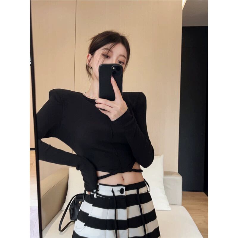 アメリカンセクシーネクタイストラップレス長袖Tシャツレディース春黒スリムフィットオールマッチショートスリムトップ ロング ブラック スプリング 春物 0921916923380161