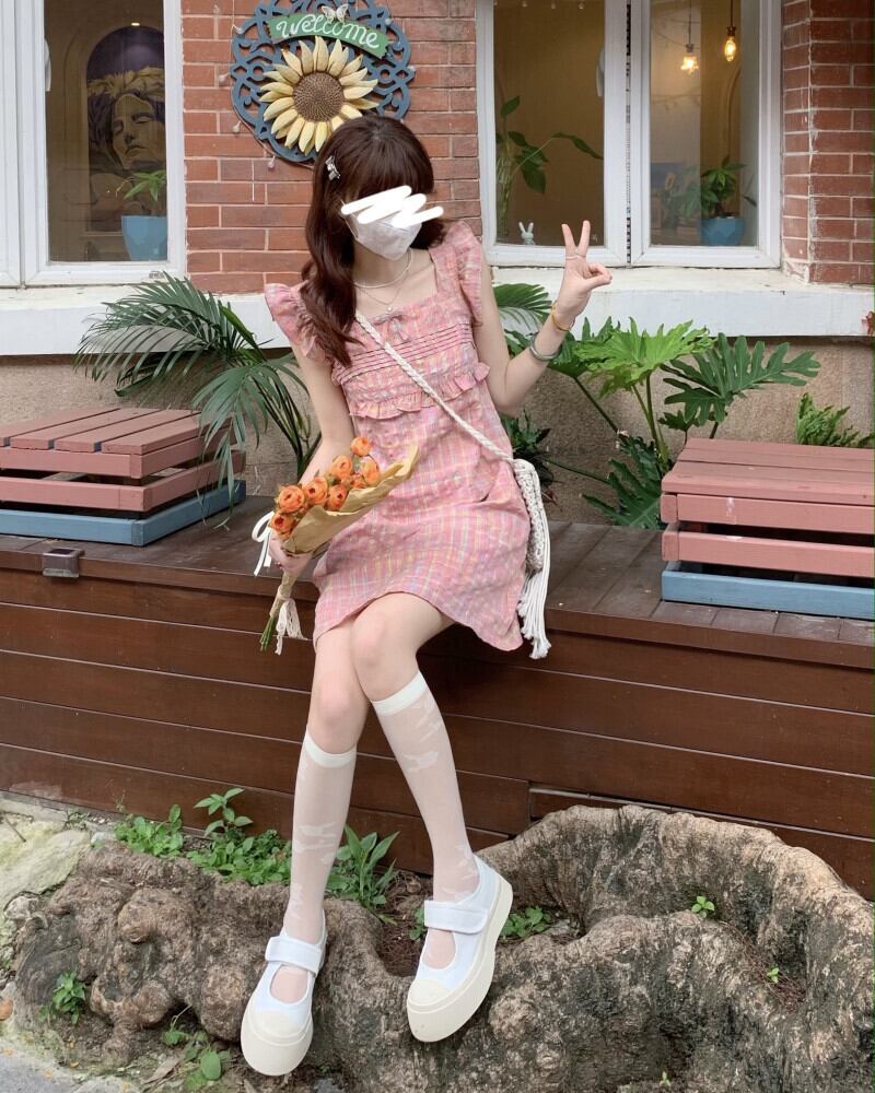 ピンクのチェック柄ちょう結び小さなフライングスリーブドレス女性の夏の 2023 新しい甘くて年齢を減らすウエスト痩身スカート リボン 大人ガーリー スウィート キュート カジュアル サマー 夏物 0921916196446047