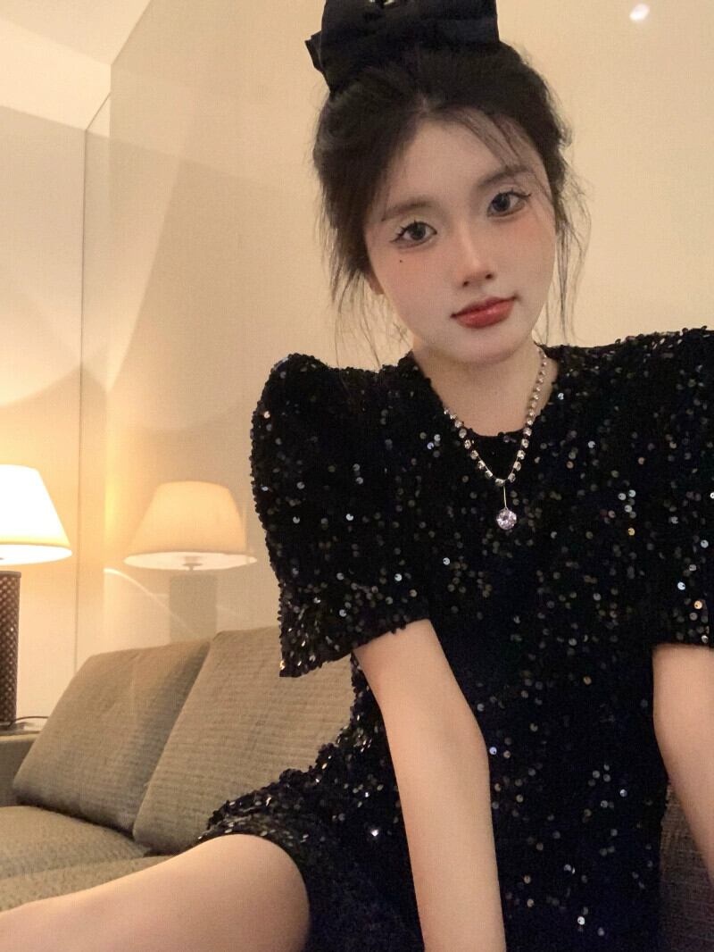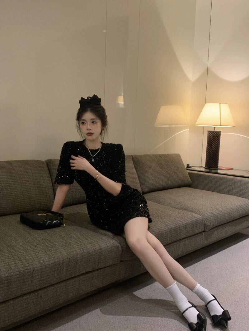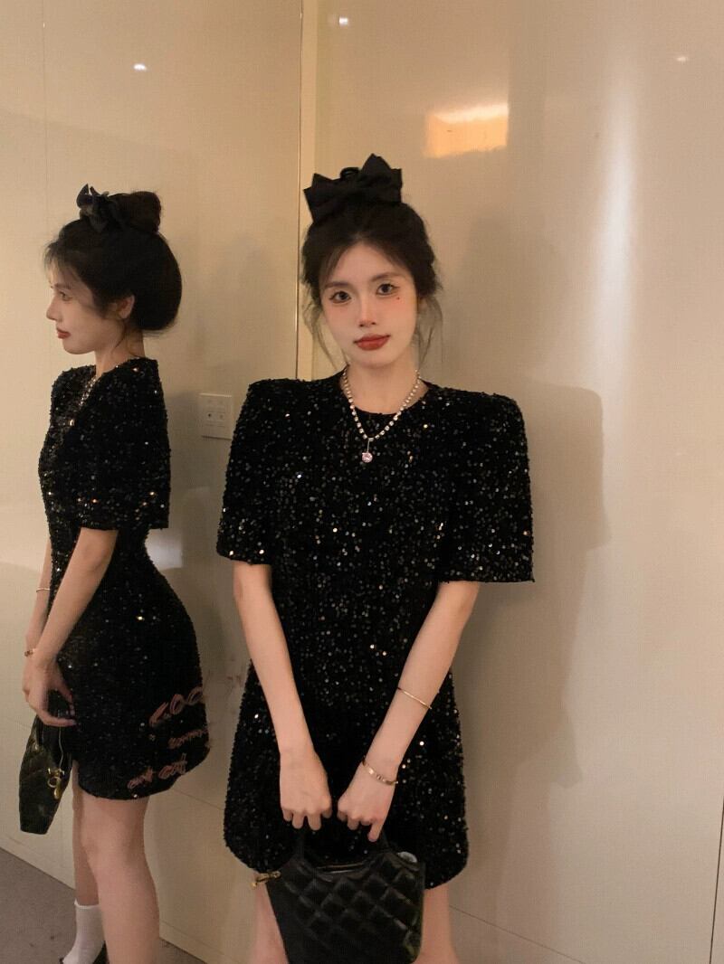 -終了黒のスパンコール半袖ドレス女性の夏の 2023 新しいオールマッチスリムで薄いボトムスカート ブラック サマー 夏物 0921994020710976