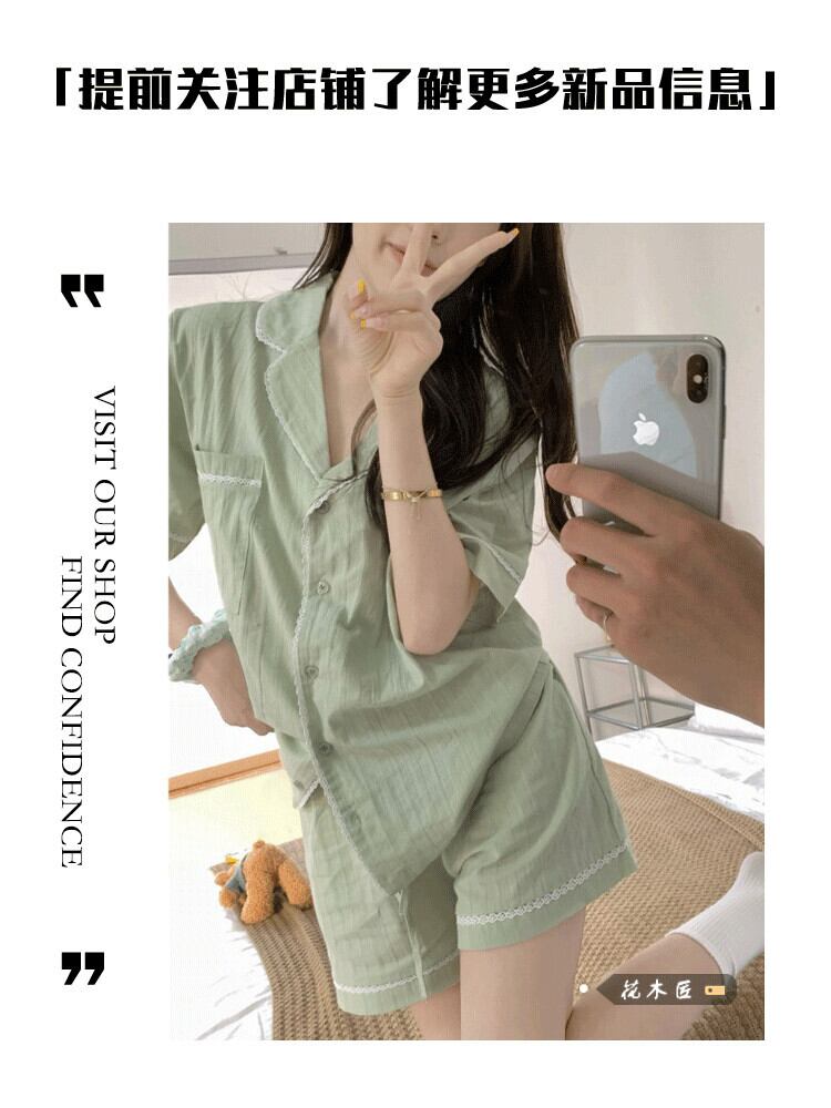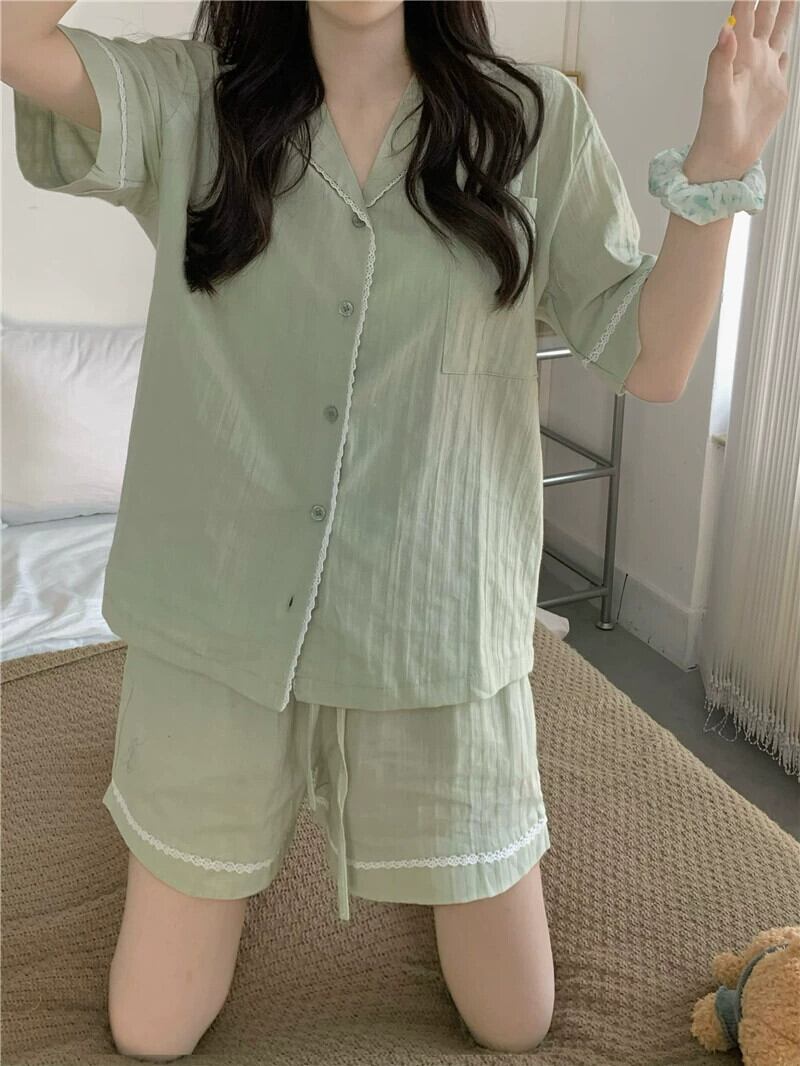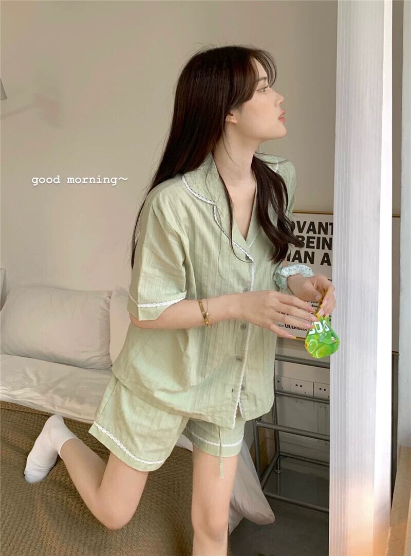 ミントグリーン シンプル パジャマ セット レディース 2023年夏新作 ラペル 半袖 トップス ショーツ ホームサービス 2点セット サマー 夏物 ブルマー 092199191409043