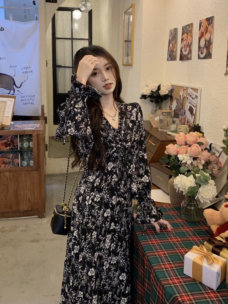 シフォン花柄 V ネック巾着長袖ドレスレディース 2023 春新作オールマッチスリムスリムミドル丈スカート ロング スプリング 春物 Vネック 0921996444465400