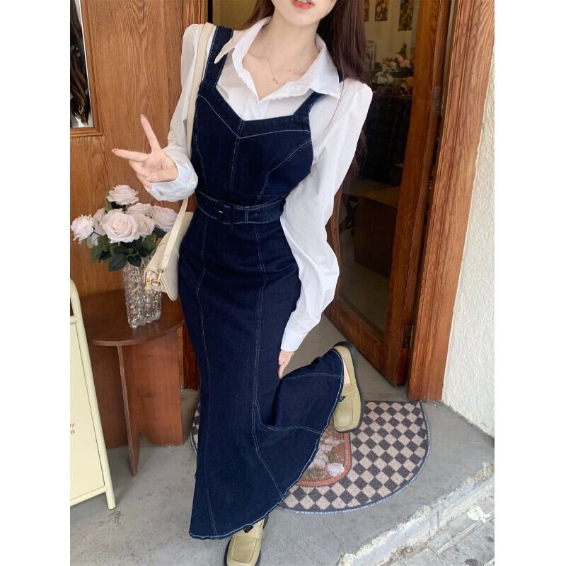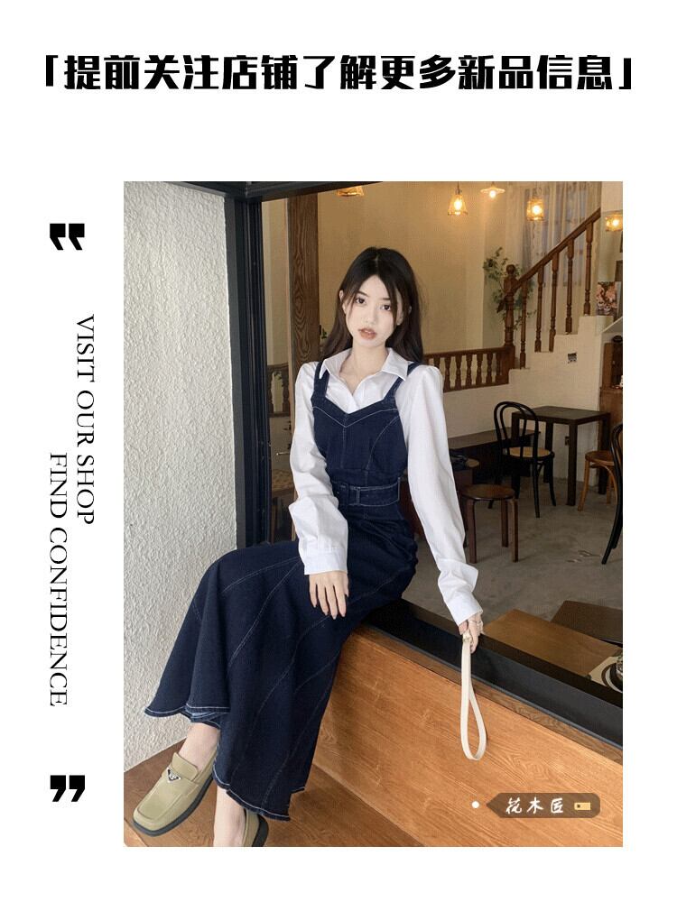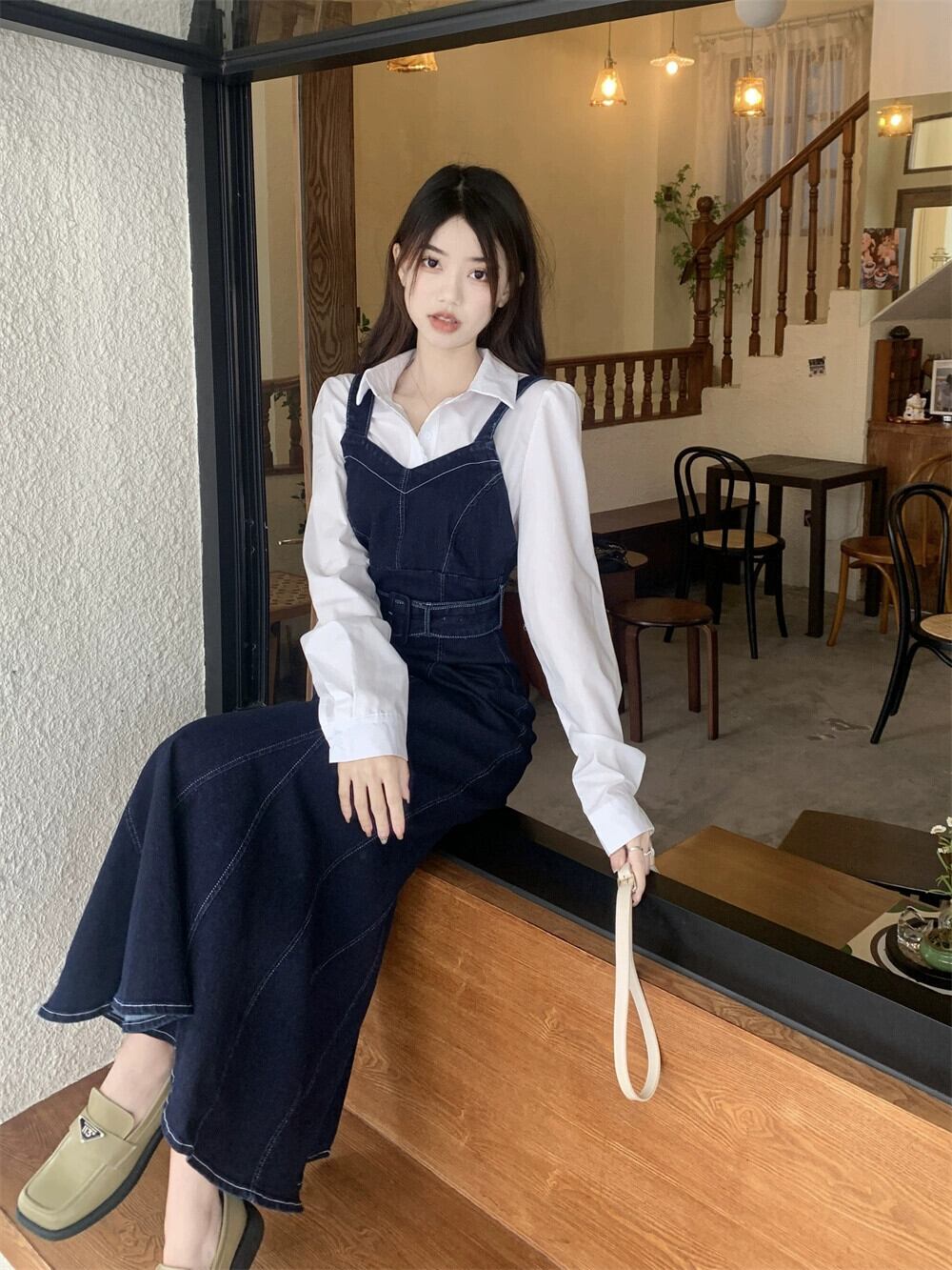 フランスの高級気質ファッションスーツ女性 2023 春の新作長袖シャツデニムサスペンダースカート 2 点セット ロング スプリング 春物 0921922179200571
