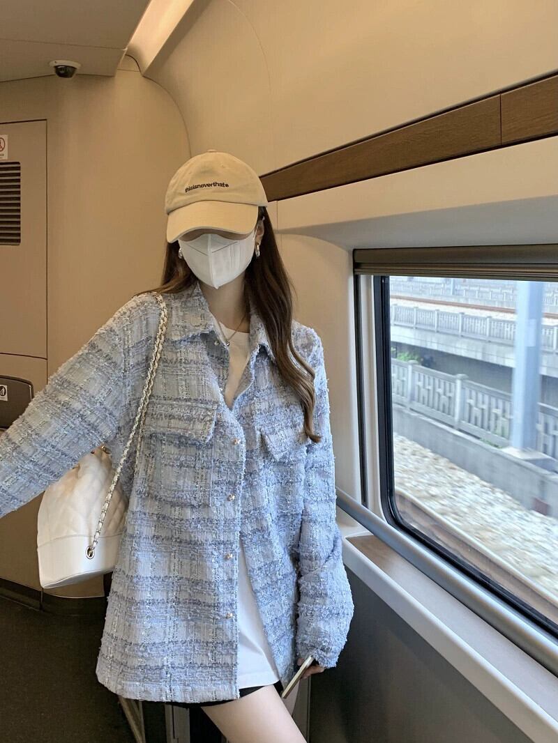気質スモールフレグランスブルーチェック柄長袖ジャケットレディース2023春新作ミドル丈ルーズスリムトップ ロング スプリング 春物 092191158077834