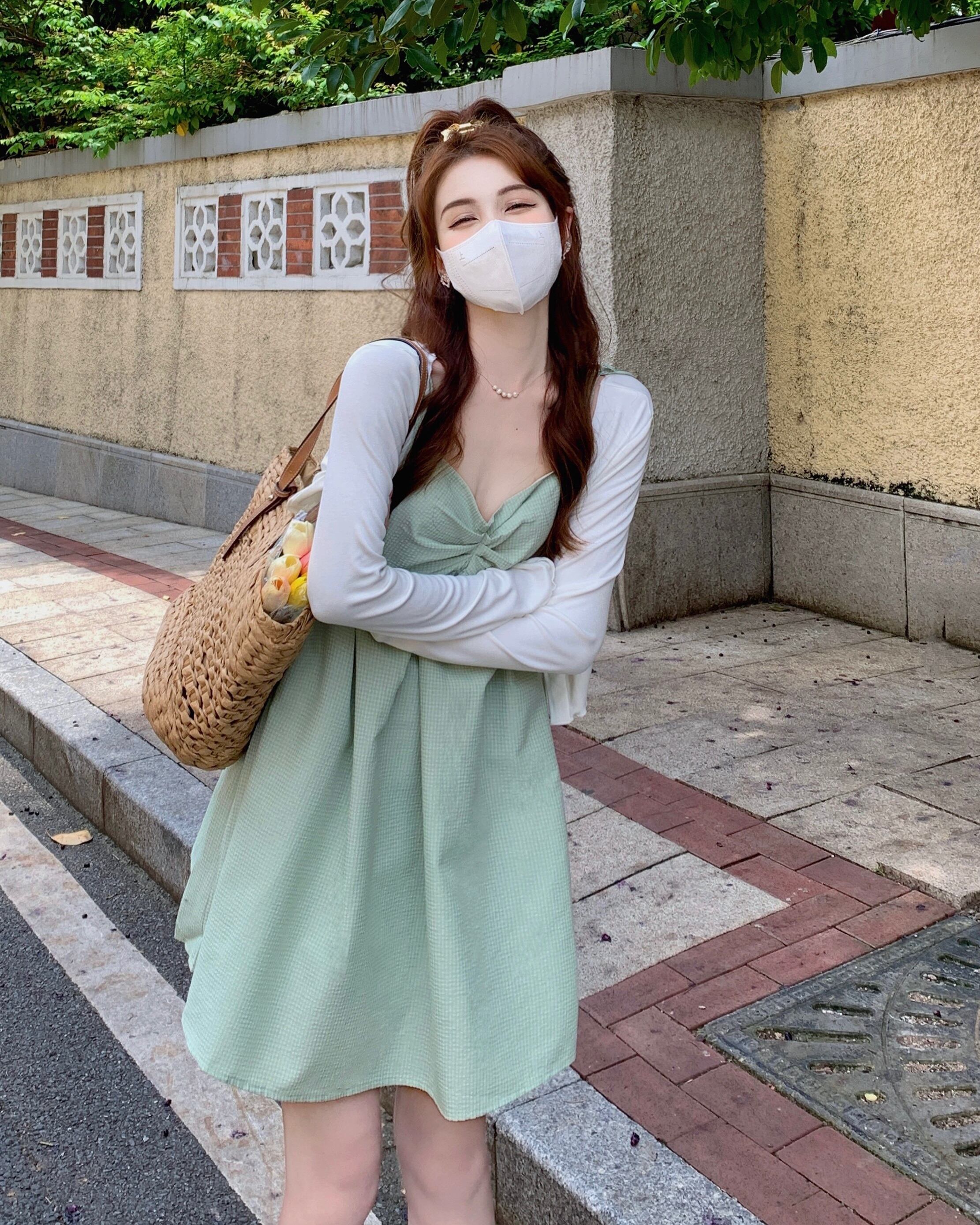 甘い小さな新鮮なフルーツグリーンチェック柄サスペンダードレス女性の夏の 2023 新しいウエストラインスリム A ラインスカート 大人ガーリー スウィート キュート カジュアル サマー 夏物 Aライン 0921963859464275