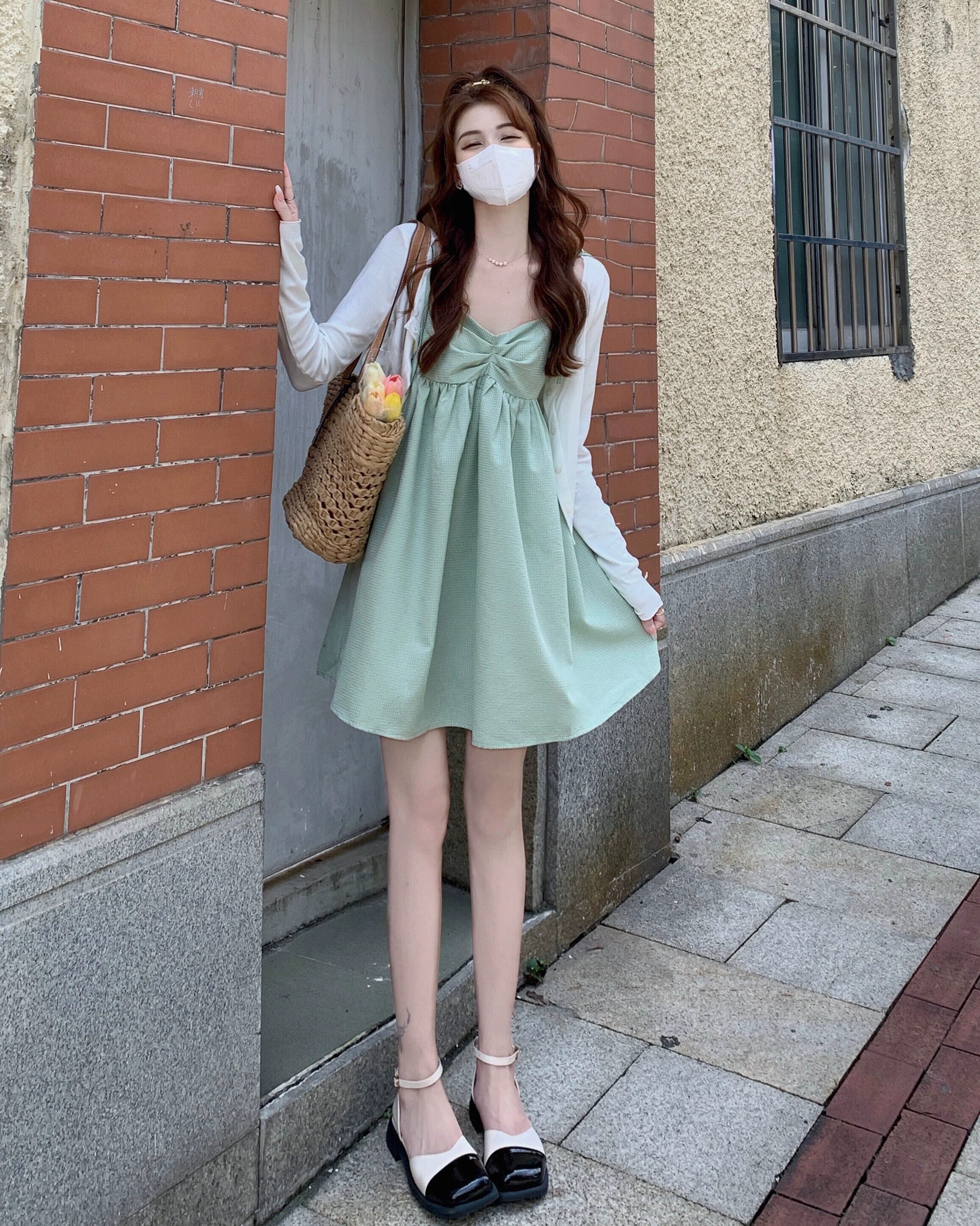 色:フルーツグリーンのサスペンダースカート,白いカーディガン