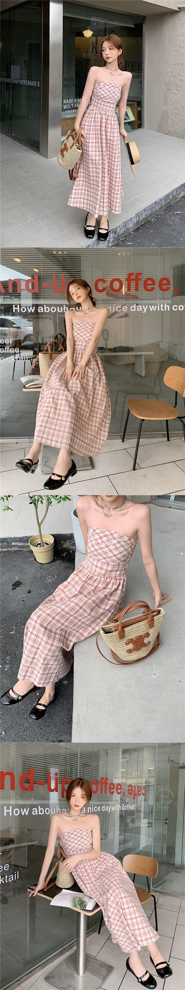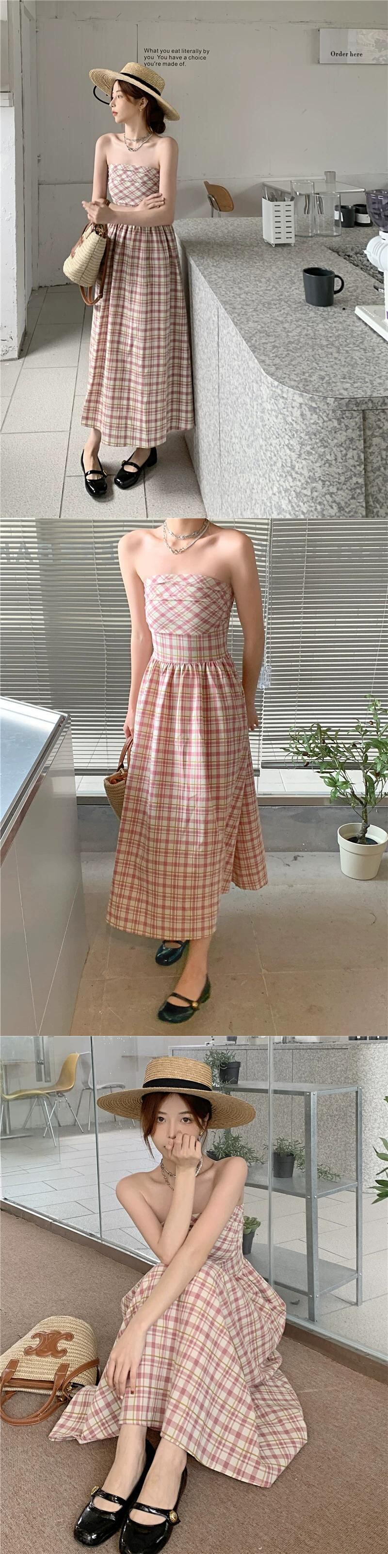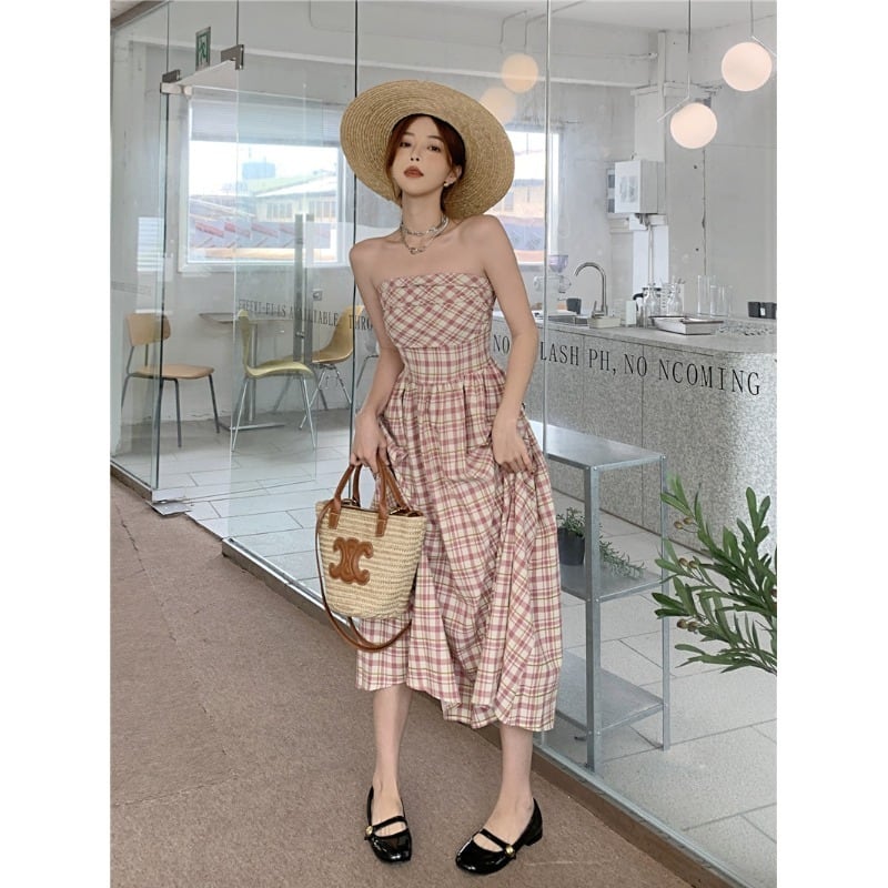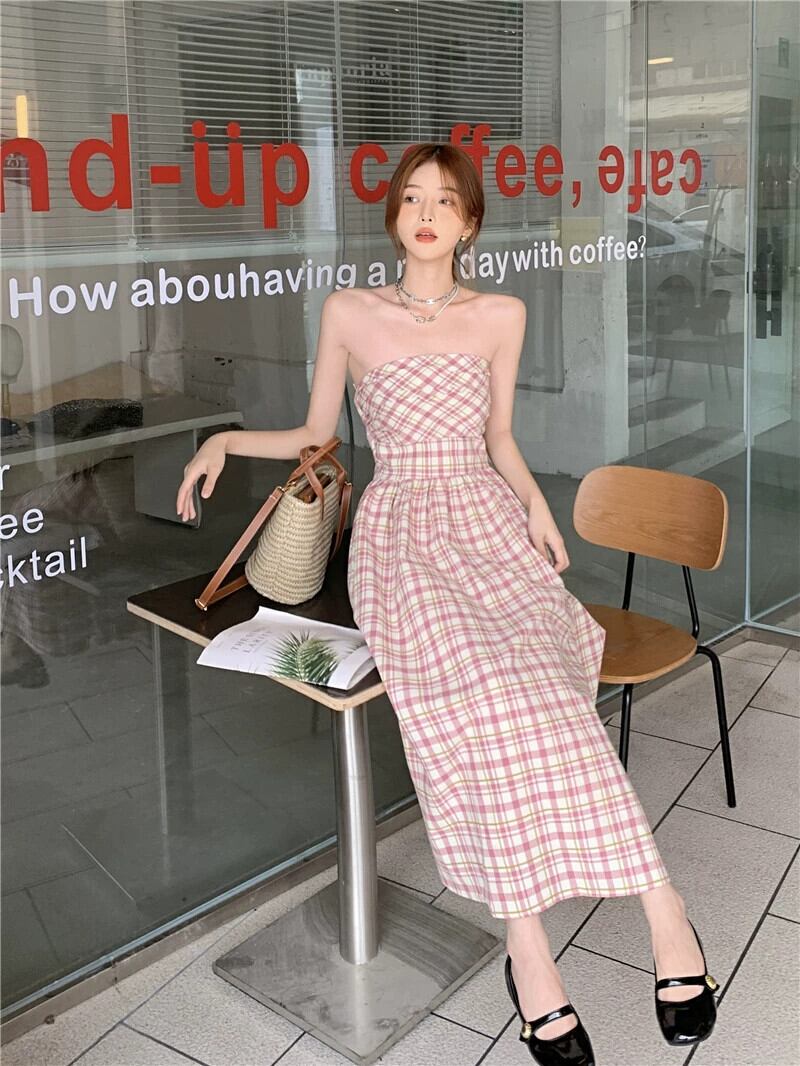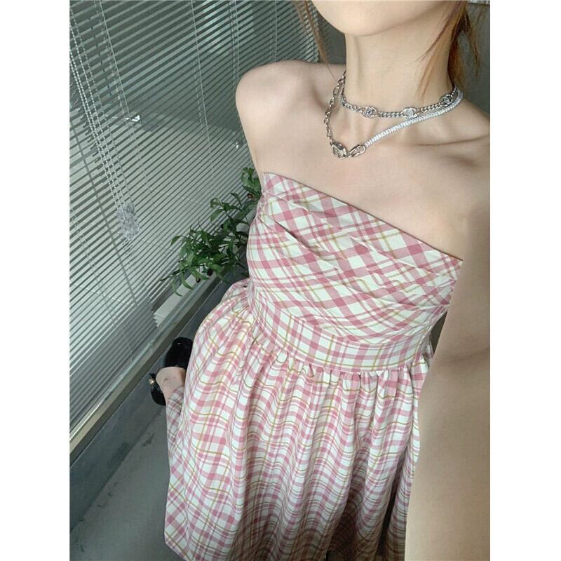 フランスの気質純粋な欲望ピンクチェック柄チューブトップドレス女性の夏の 2023 新しいスリムスリムミドル丈スカート サマー 夏物 ピュア 0921916943147550