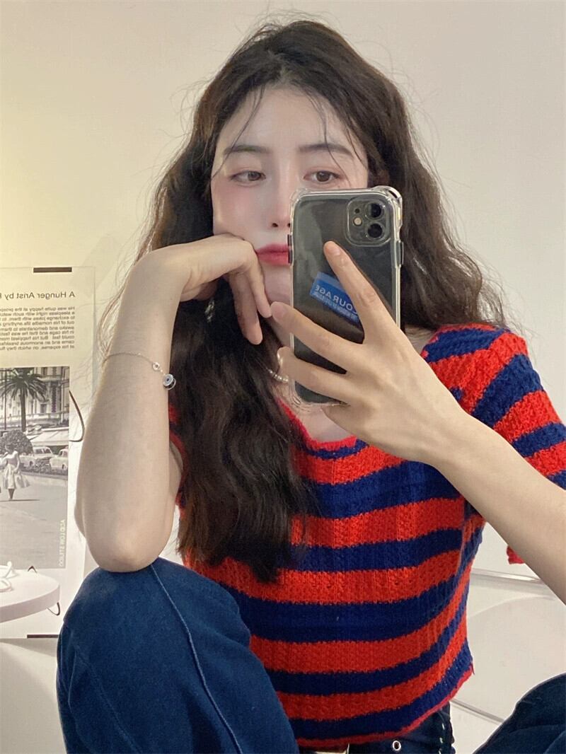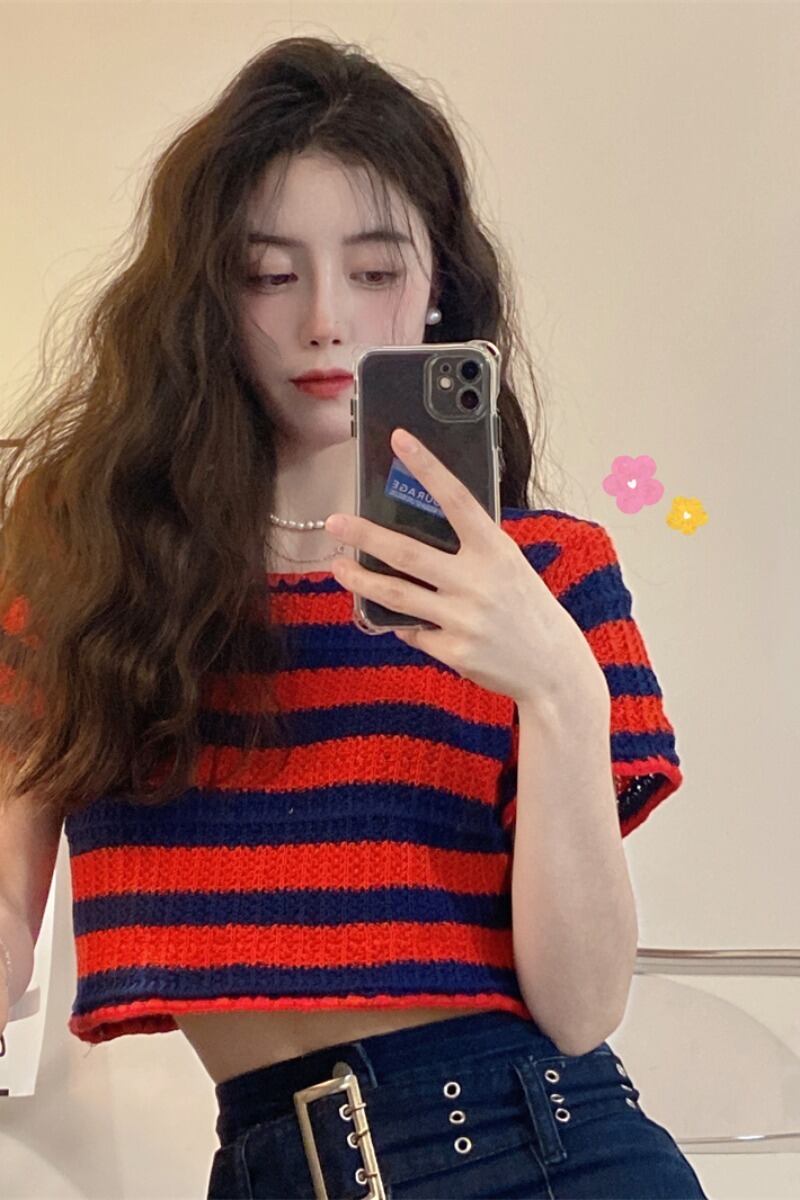 ゴーストホースヒットカラーストライプ半袖ニットセーター女性の夏の 2023 新しいレトロかぎ針編みルーズショートトップ サマー 夏物 0921925542736161