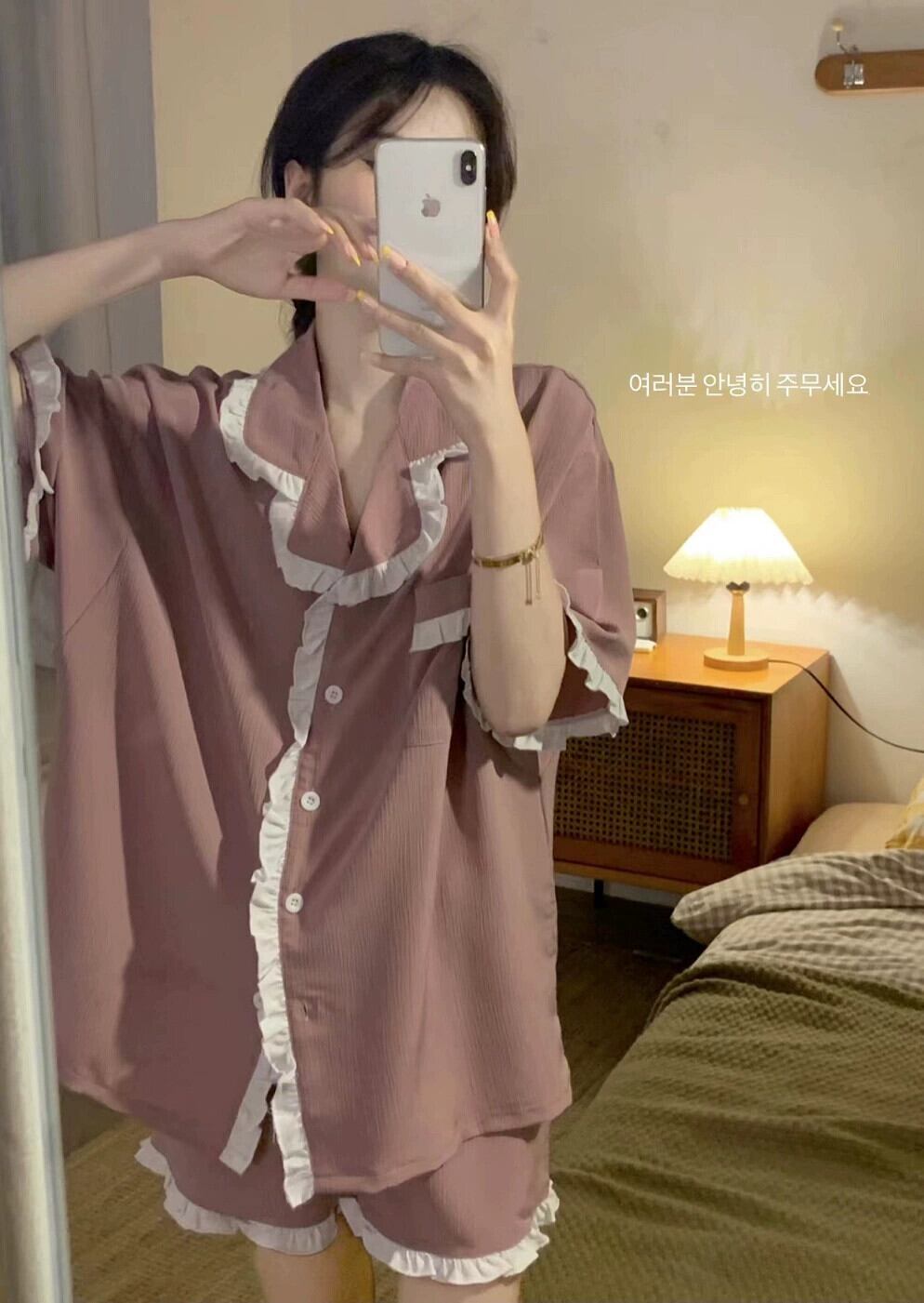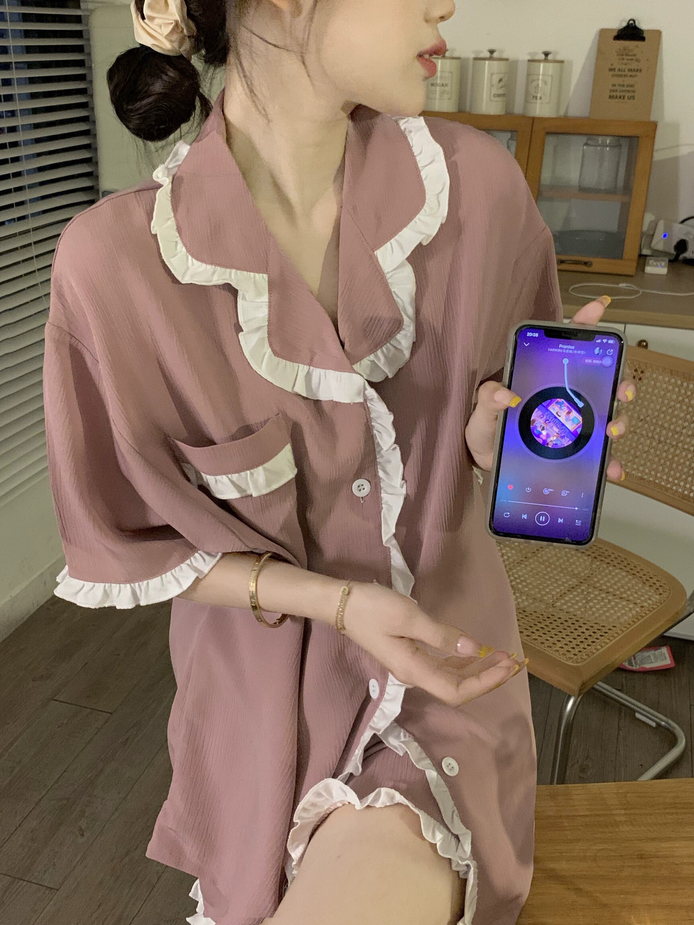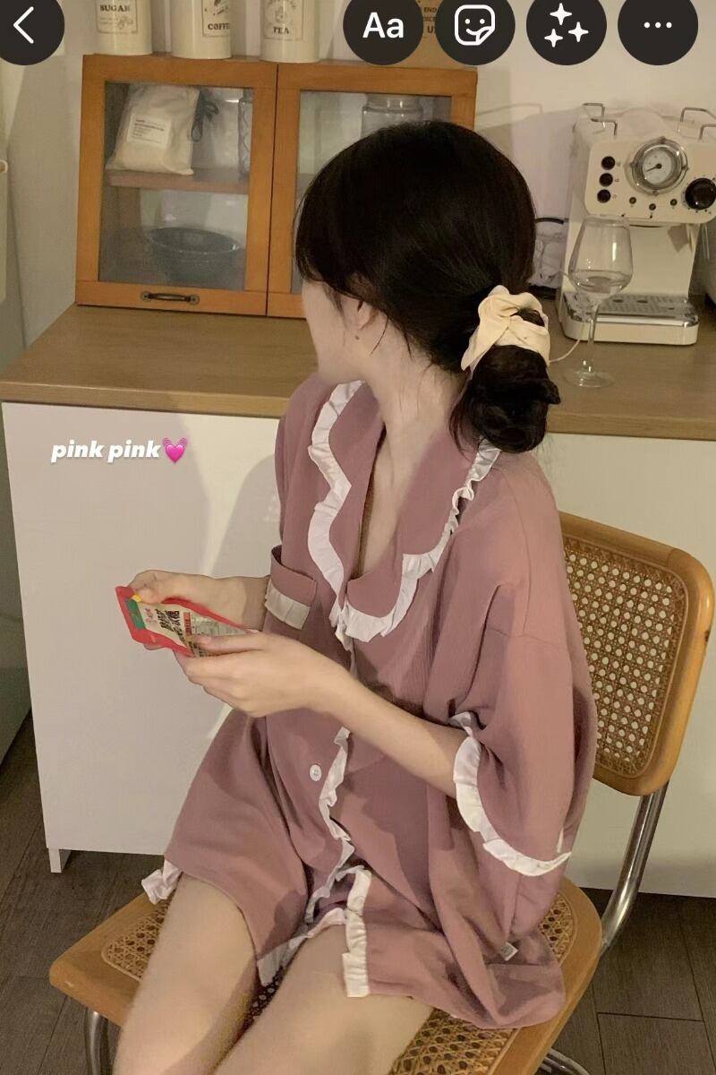甘菌レース人形襟半袖パジャマセット女性の夏のパジャマショーツカジュアルホームサービス 2 点セット 大人ガーリー スウィート キュート サマー 夏物 ブルマー 0921912985603329