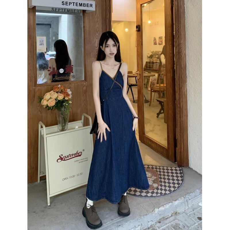 フレンチレトロ V ネックサスペンダードレス女性の夏の 2023 新しいオールマッチスリムスリムボトムミッドレングススカート サマー 夏物 Vネック 0921957148648868