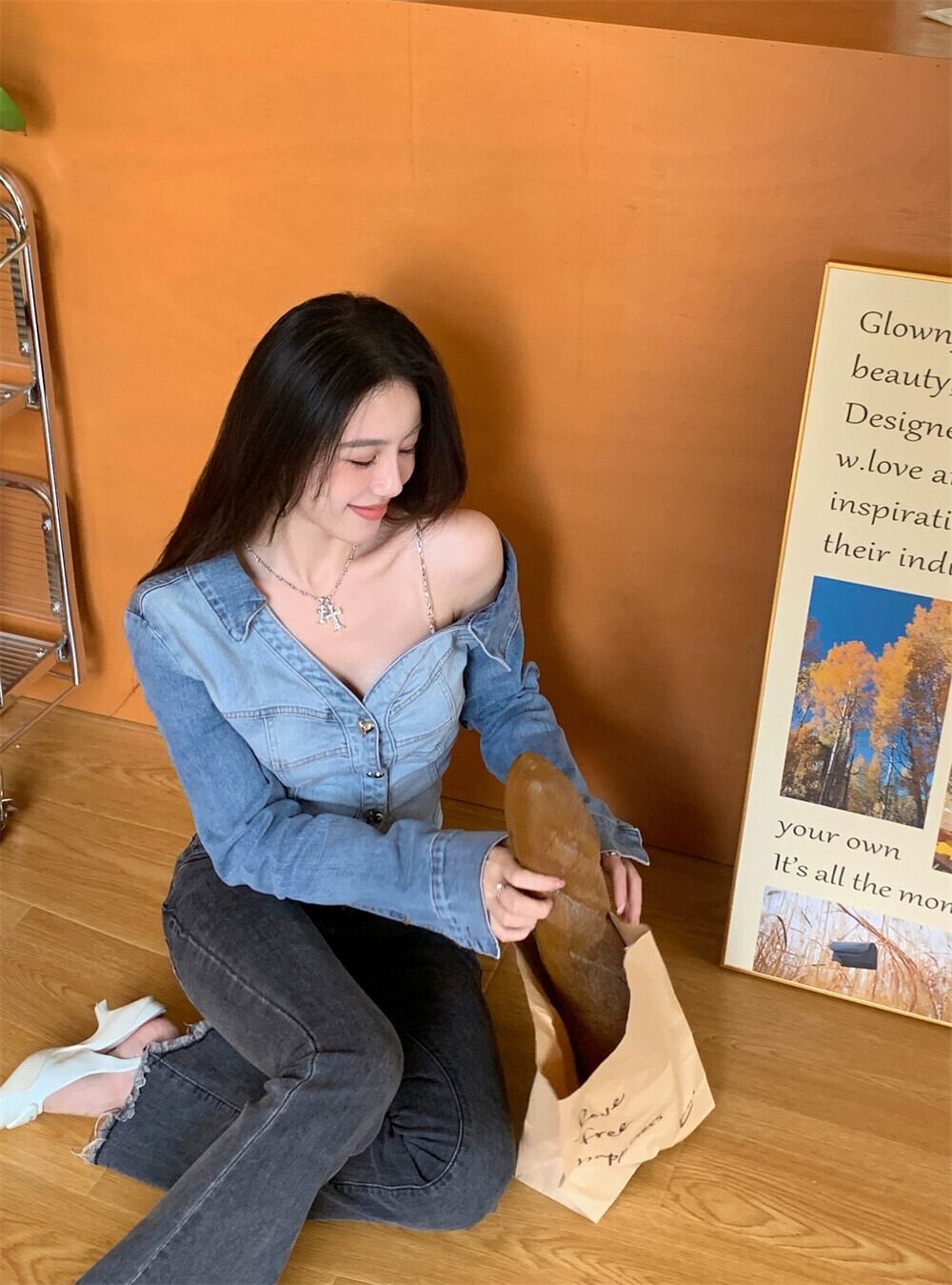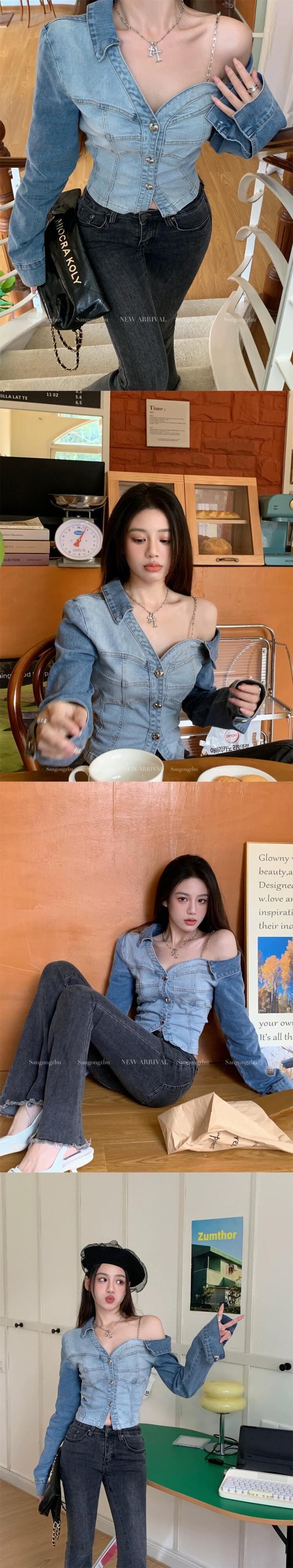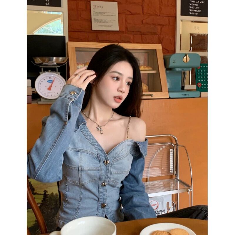 センスニッチ ストラップレス チェーン シャツ レディース 2023 夏の新作 スリム スリム 長袖 デニム トップ ロング サマー 夏物 0921932832992557