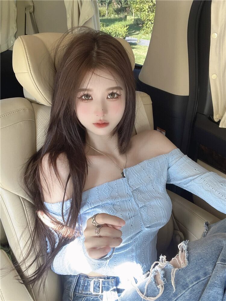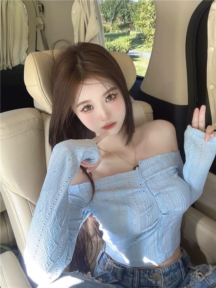 Sweet Spice Girls ワンショルダー長袖Tシャツ レディース 2023春新作 折り目感 ブルー スリムショートトップス ロング 大人ガーリー スウィート キュート カジュアル スプリング 春物 0921997796006612