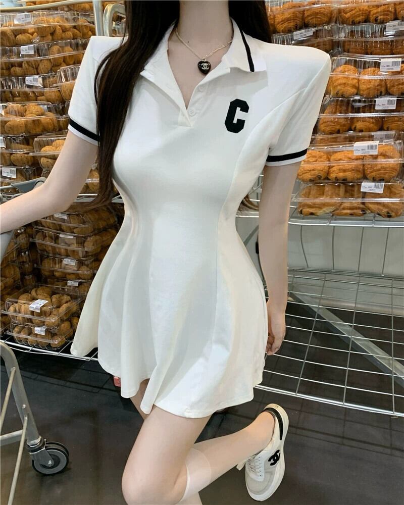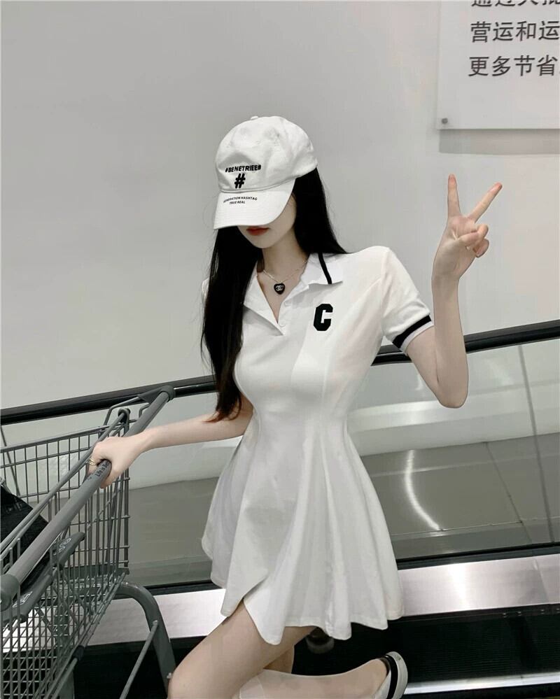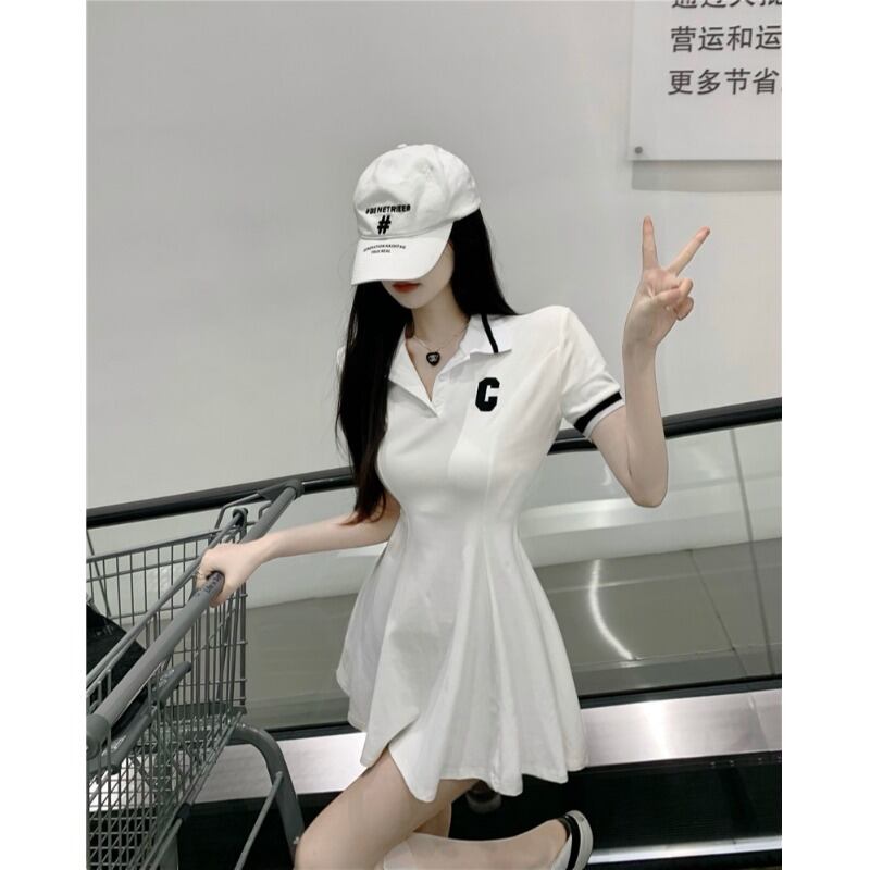 スタイル純粋な欲望スタイルポロ襟半袖ドレス女性の夏 2023 新文字ステッカーウエストストラップスカート サマー 夏物 ピュア 0921937087791170