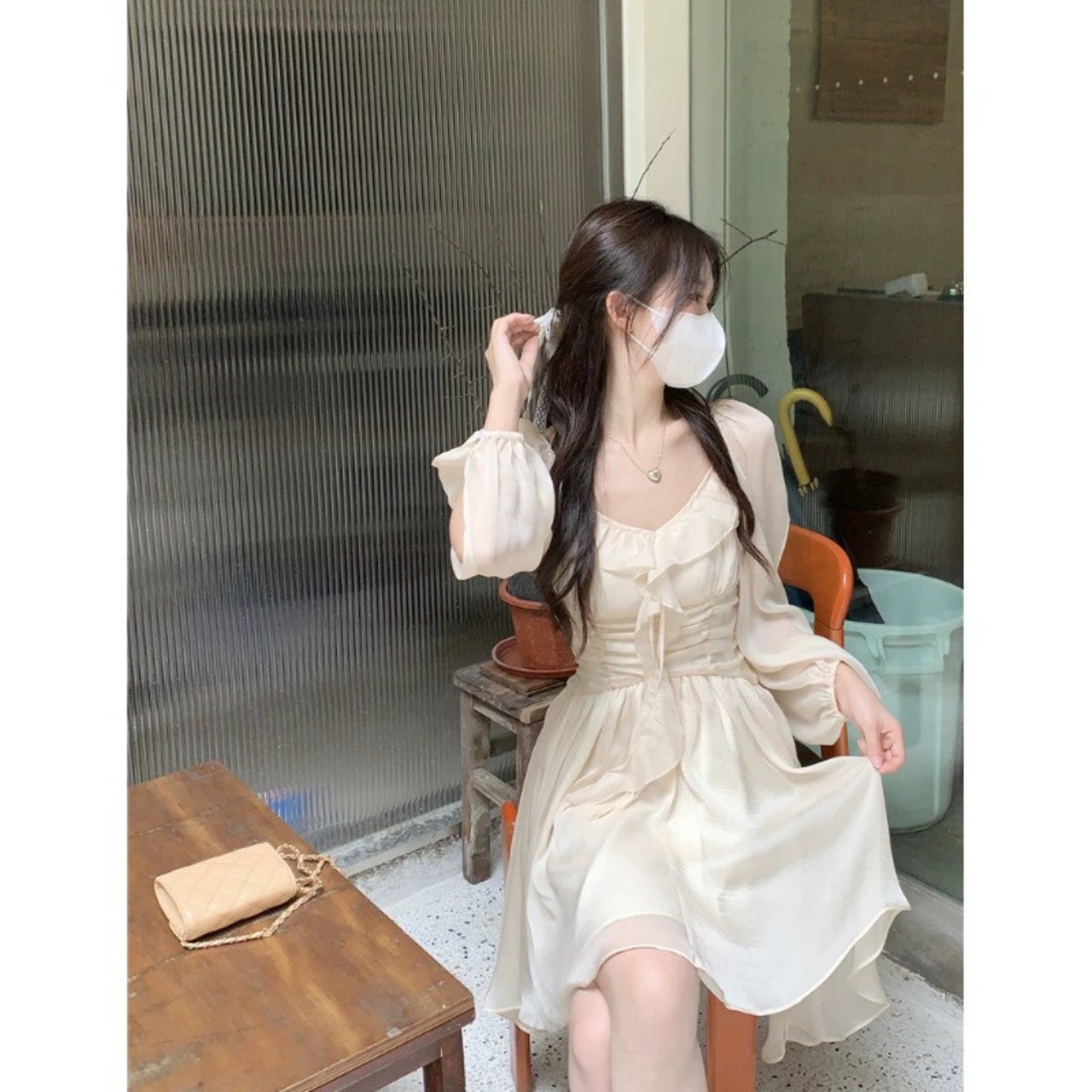 フレンチフリル長袖ドレス妖精春高級ドレス優しい風ウエストウエスト気質Aラインスカート ロング ラッフル スプリング 春物 0921951231999926