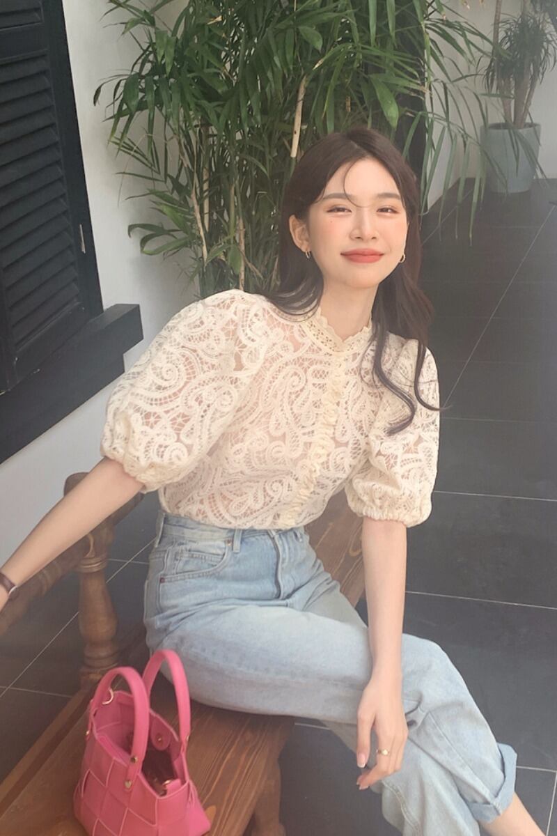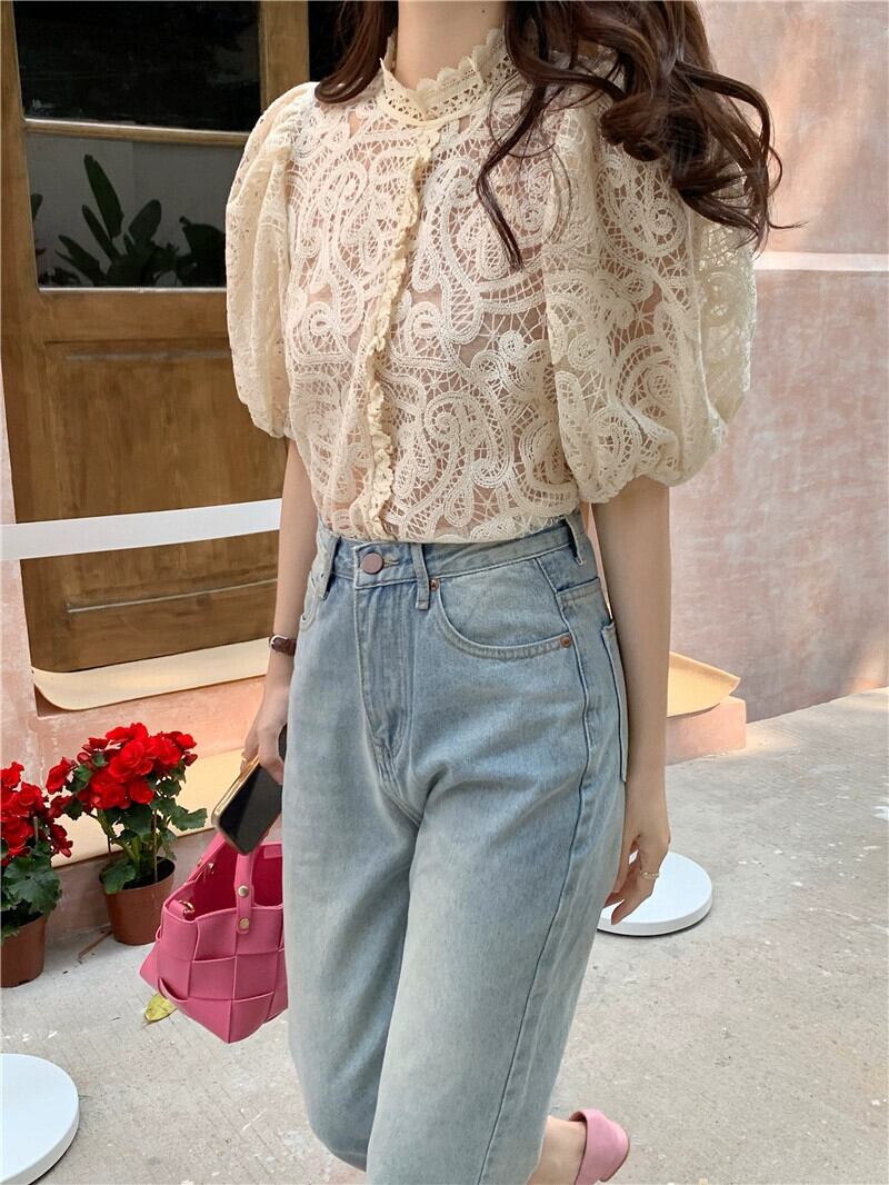 レトロな気質スタンドカラーレースシャツ女性の夏の 2023 新しいフレンチスイートパフスリーブニッチスリムトップ 大人ガーリー スウィート キュート カジュアル サマー 夏物 0921994635374530