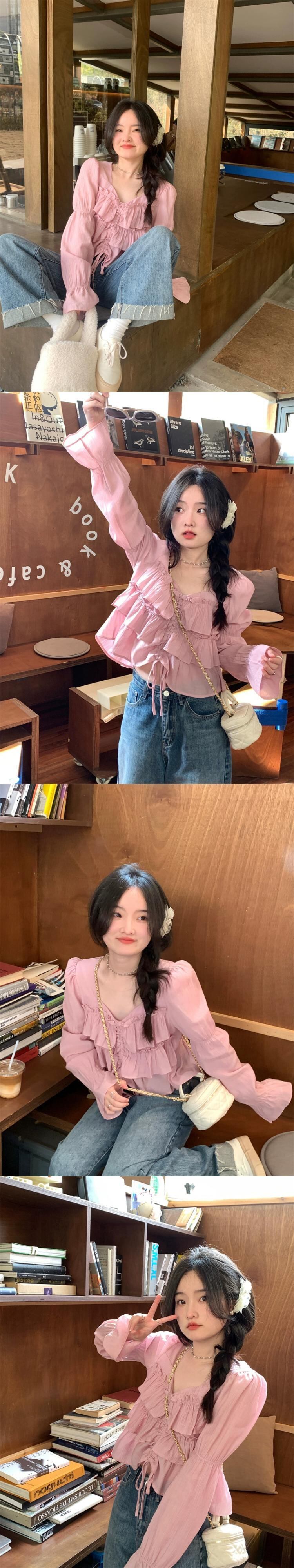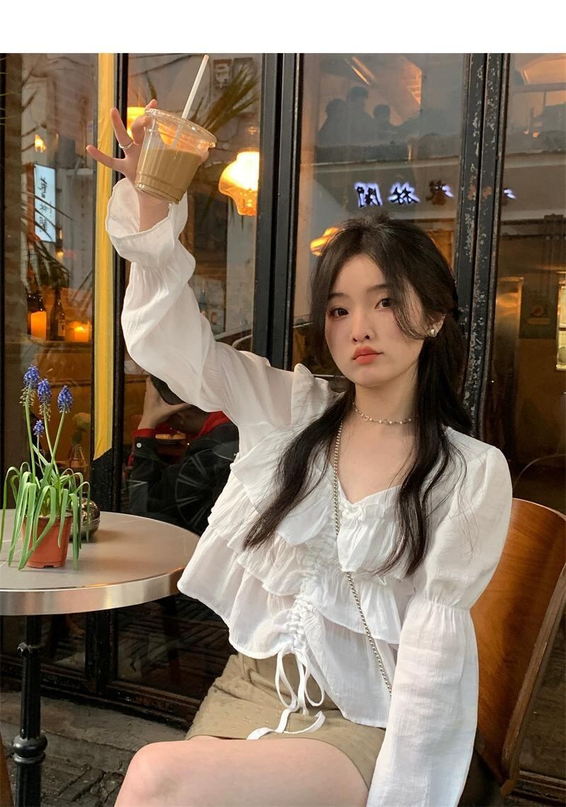 フレンチスイートフリルVネック長袖シャツレディース夏デザインセンスニッチ巾着ショートシャツトップ ロング 大人ガーリー スウィート キュート カジュアル サマー 夏物 0921911089892699