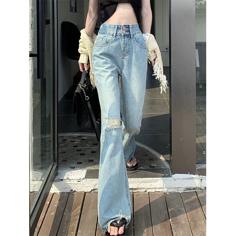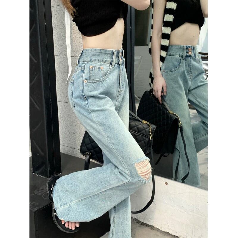 ウォッシュドライトブルーリップドジーンズレディース2023年夏新作オールマッチカジュアルハイウエストスリムワイドレッグパンツ ハイウェスト サマー 夏物 0921973973829746