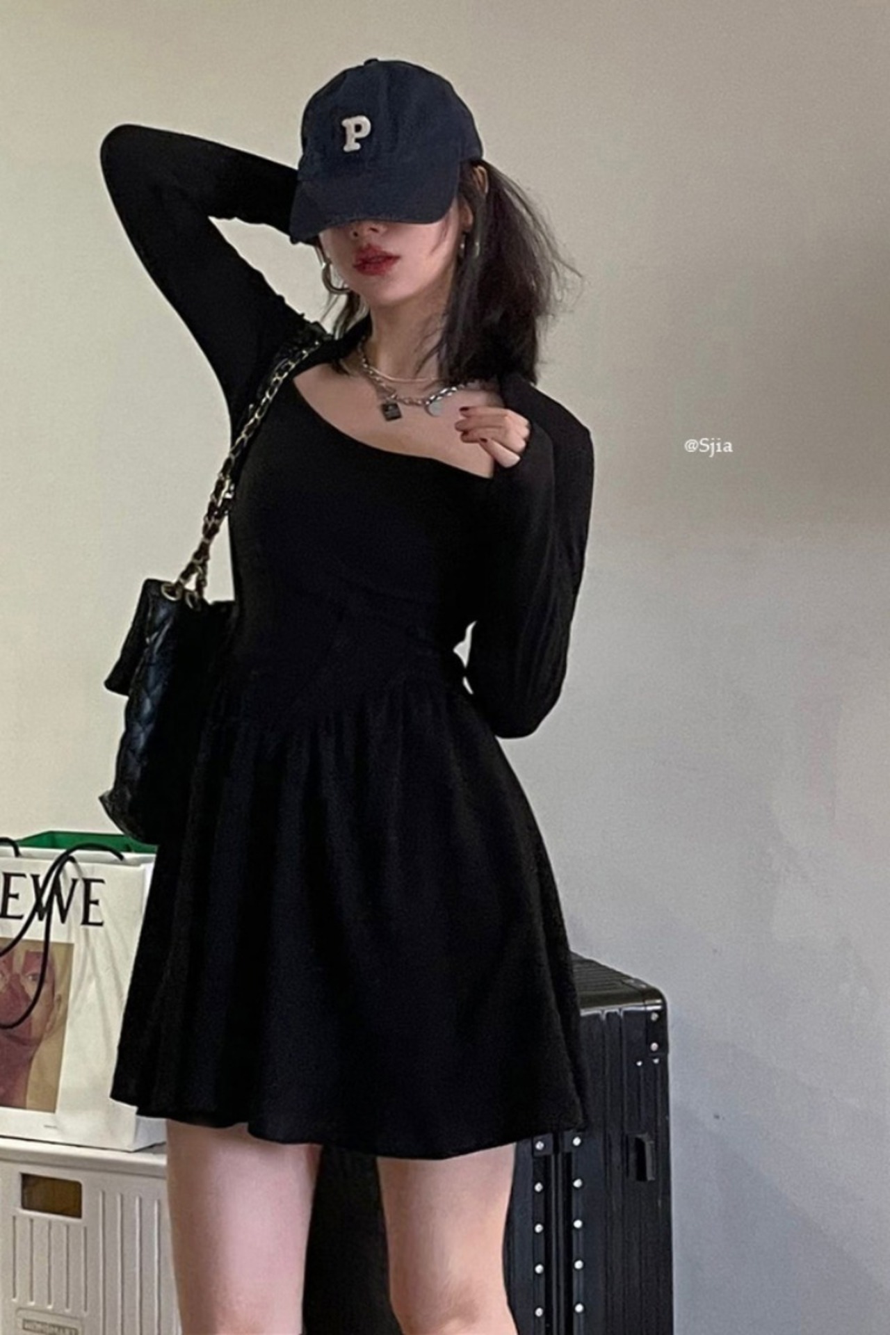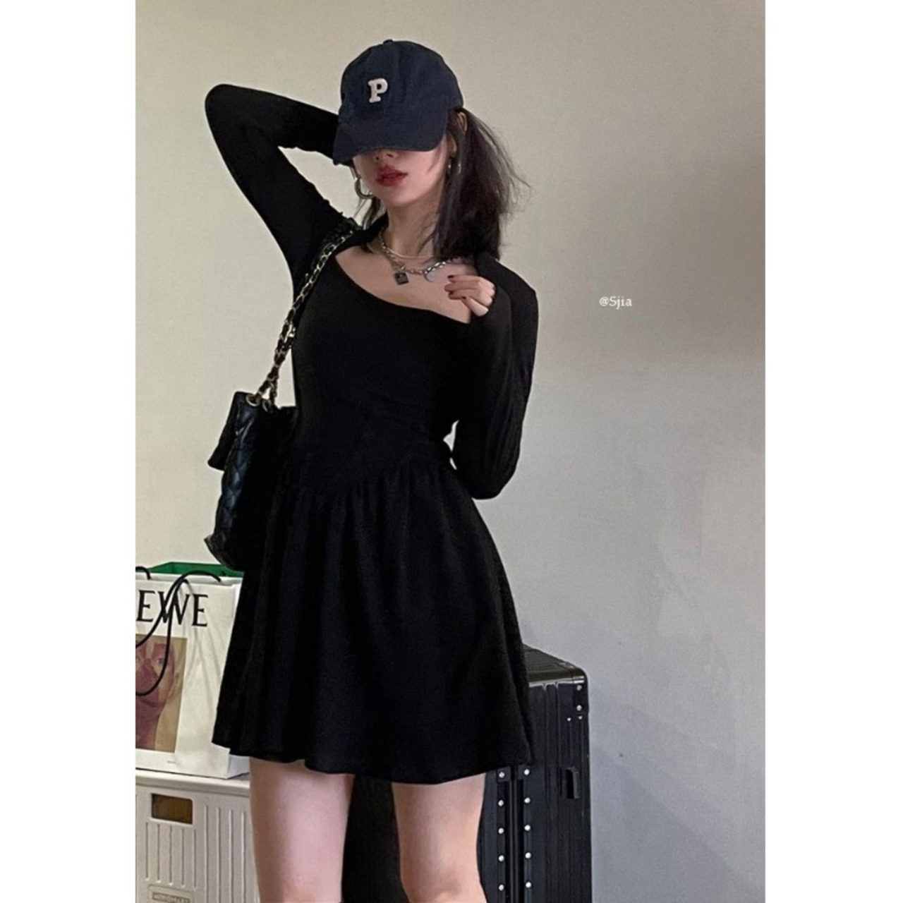 フレンチスタイルサンディング肥厚気質スクエアカラードレス女性の夏の 2023 新しいウエストライン痩身黒底スカート ブラック サマー 夏物 スクウェア 0921912094870002