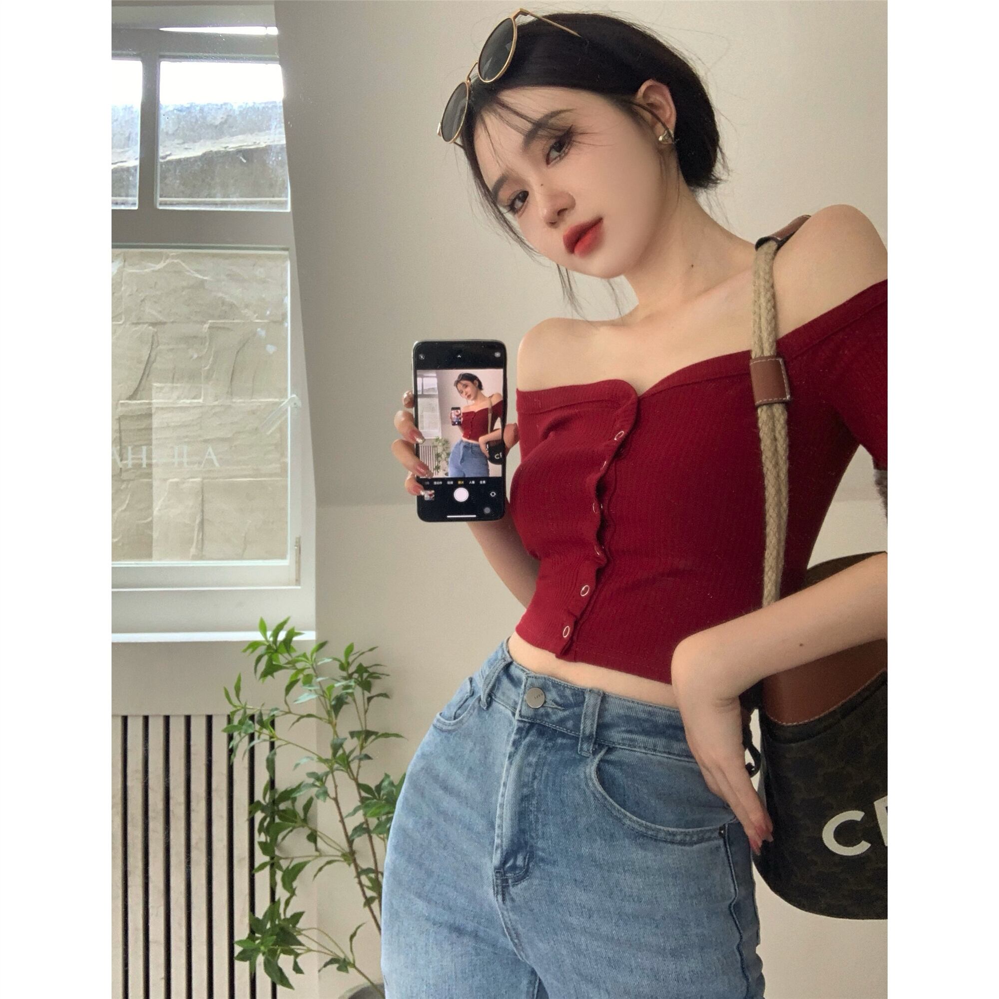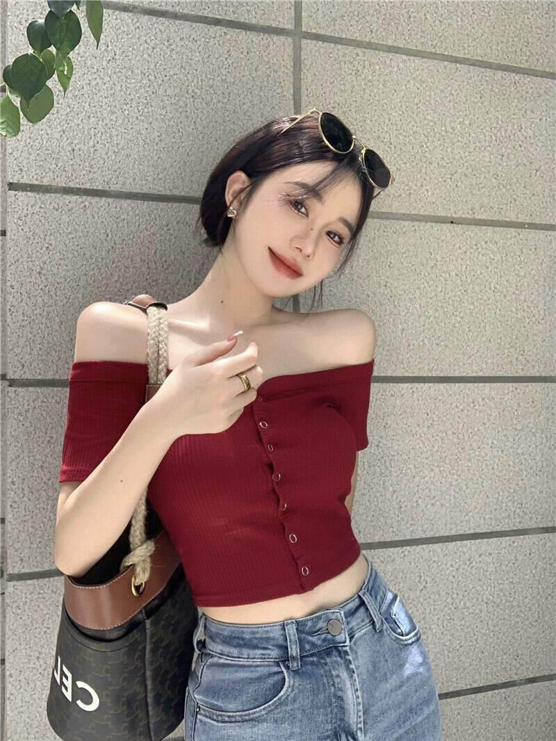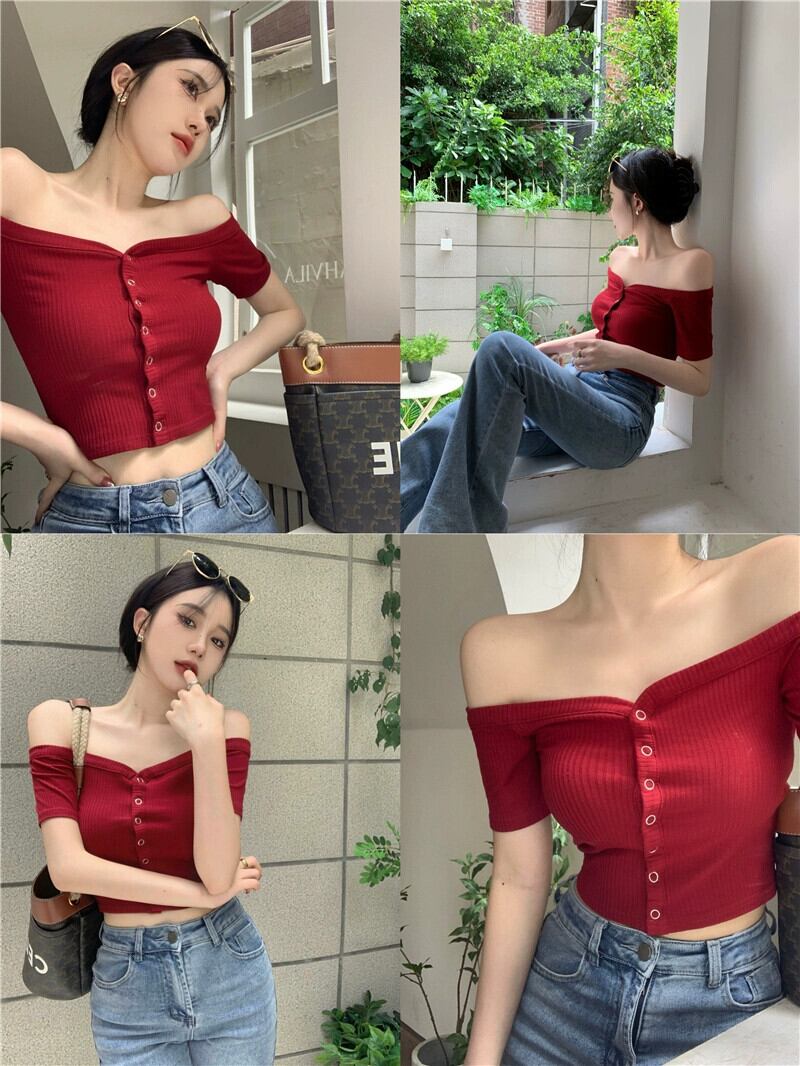 香港スタイルのレトロな赤のワンショルダー半袖 Tシャツ女性の夏の 2023 新しいハイウエスト痩身クロップトップ ハイウェスト レッド サマー 夏物 0921980655327967
