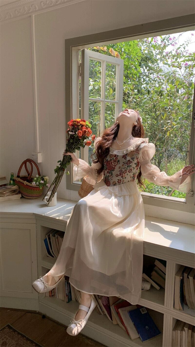 レトロ宮殿スタイルのスプライシング長袖ドレスの女性の夏の 2023 新しいスタイルのウエストと薄いアウターウェアのミドル丈のスカート ロング レース サマー 夏物 0921939225756484
