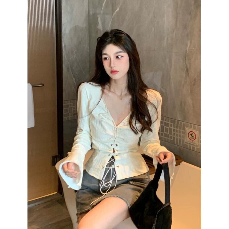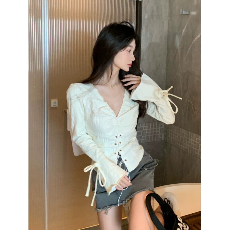ニッチデザイン V ネックネクタイ長袖シャツレディース 2023 夏の新しいシックなトランペットスリーブプリーツスリムトップ ロング サマー 夏物 Vネック 0921937190994985