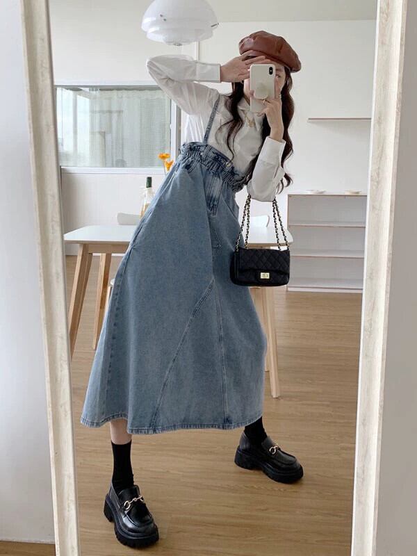 年齢を減らすレトロなサスペンダードレスの女性の夏の 2023 新しい緩くて薄いミドル丈デニムスカート サマー 夏物 0921923171440749