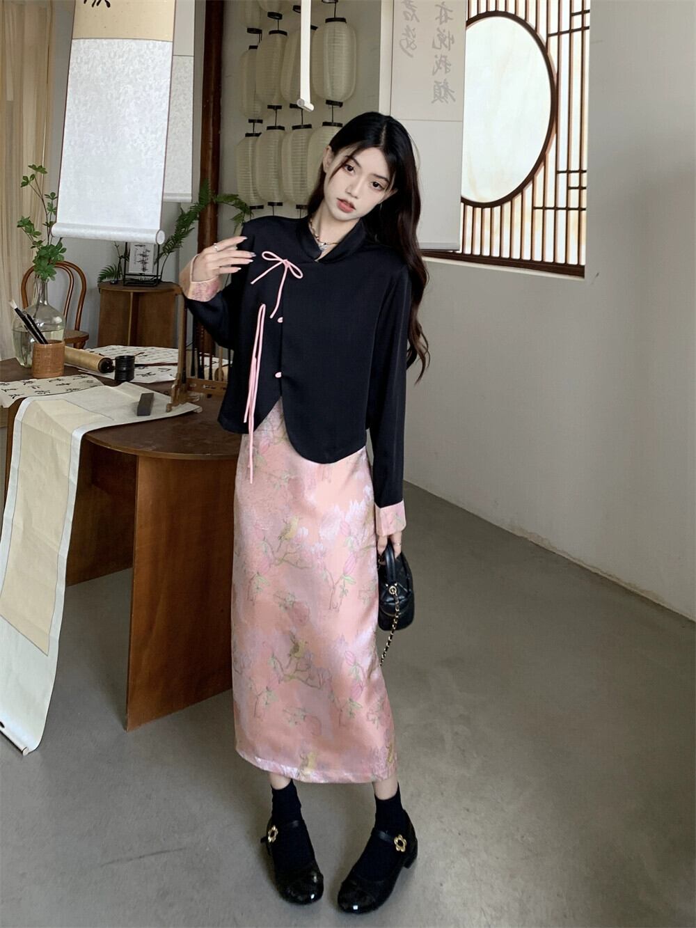 色:黒いシャツ,ピンクのスカート
