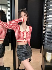 甘くてスパイシーなスタイルの対照的な色の刺繍チェック柄ニットセーター婦人服 2023 春の新しいスリムフィット薄いオールマッチショートトップ レッド 大人ガーリー スウィート キュート カジュアル スプリング 春物 0921982852189673