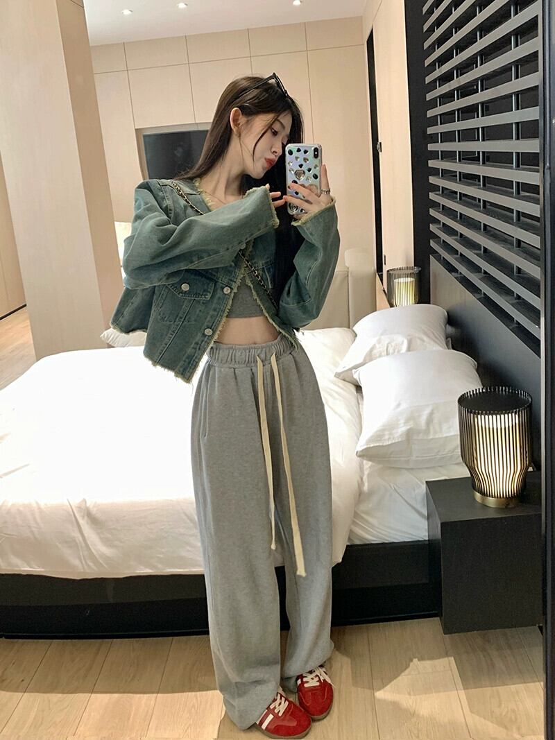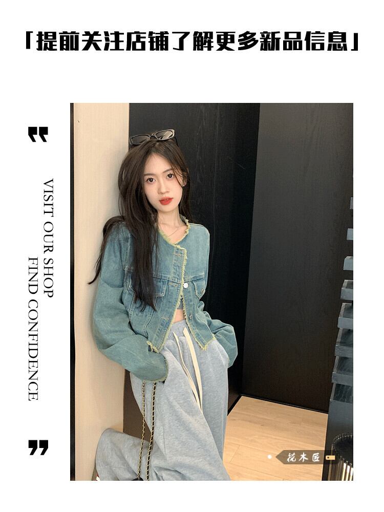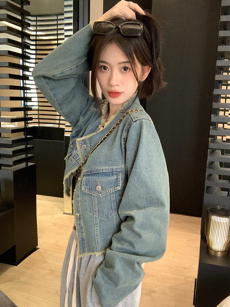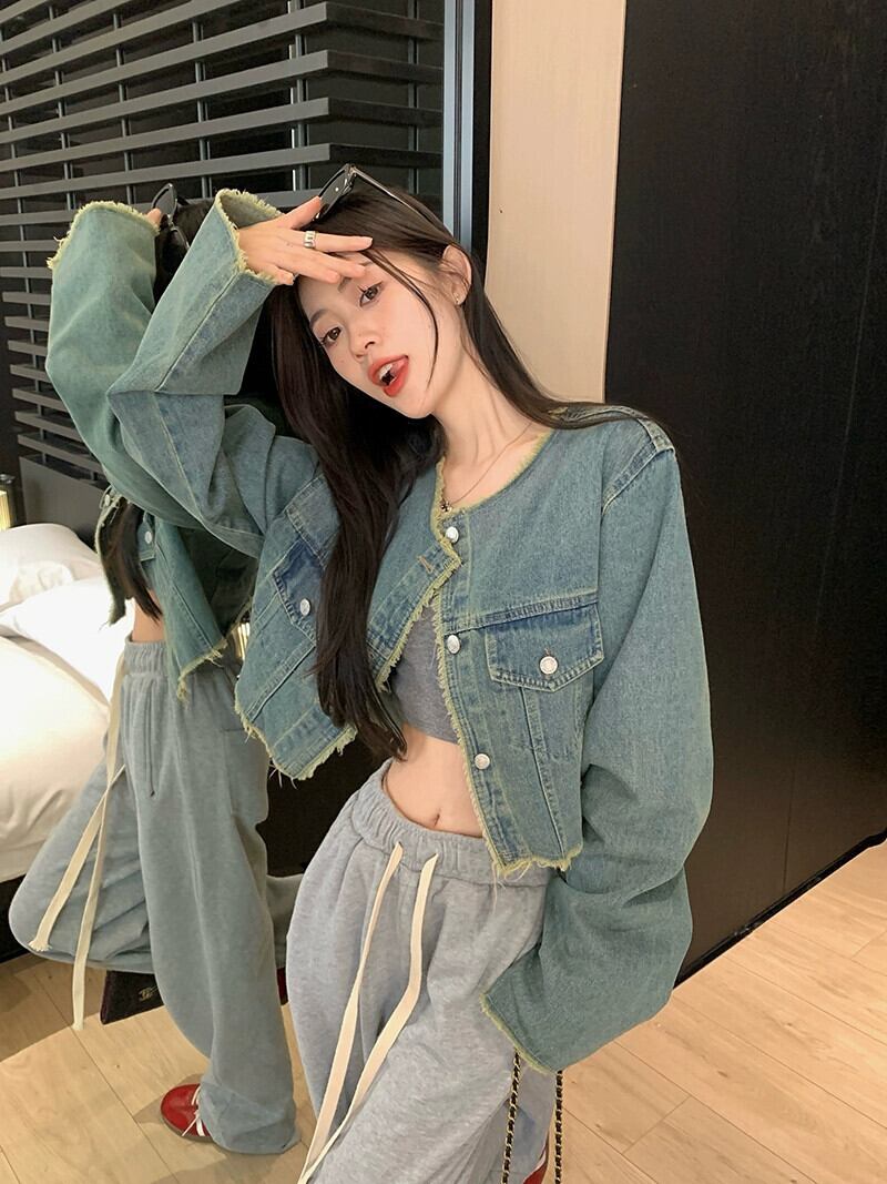 レトロステッチローエッジラウンドネックデニムジャケット2023春ハンサムな個性ルーズショートトップ スプリング 春物 Oネック 0921973878484757