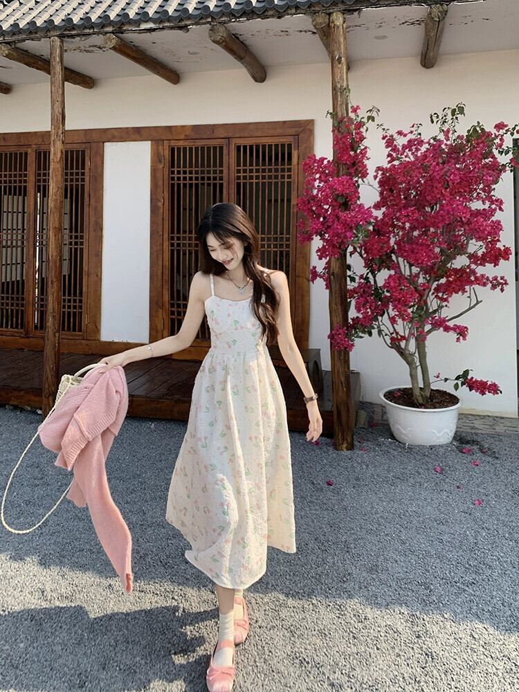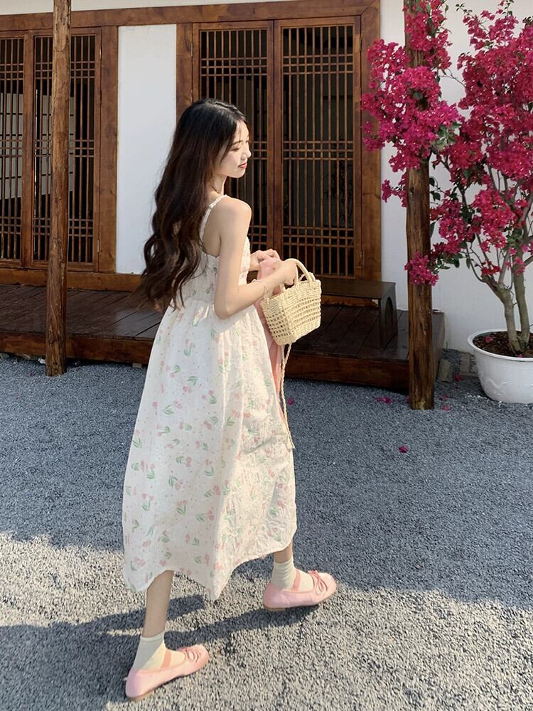 フランスのロマンチックなチューリップの花サスペンダードレス女性の夏の 2023 新しいミッドレングスオールマッチスカート サマー 夏物 花柄 0921946591894675