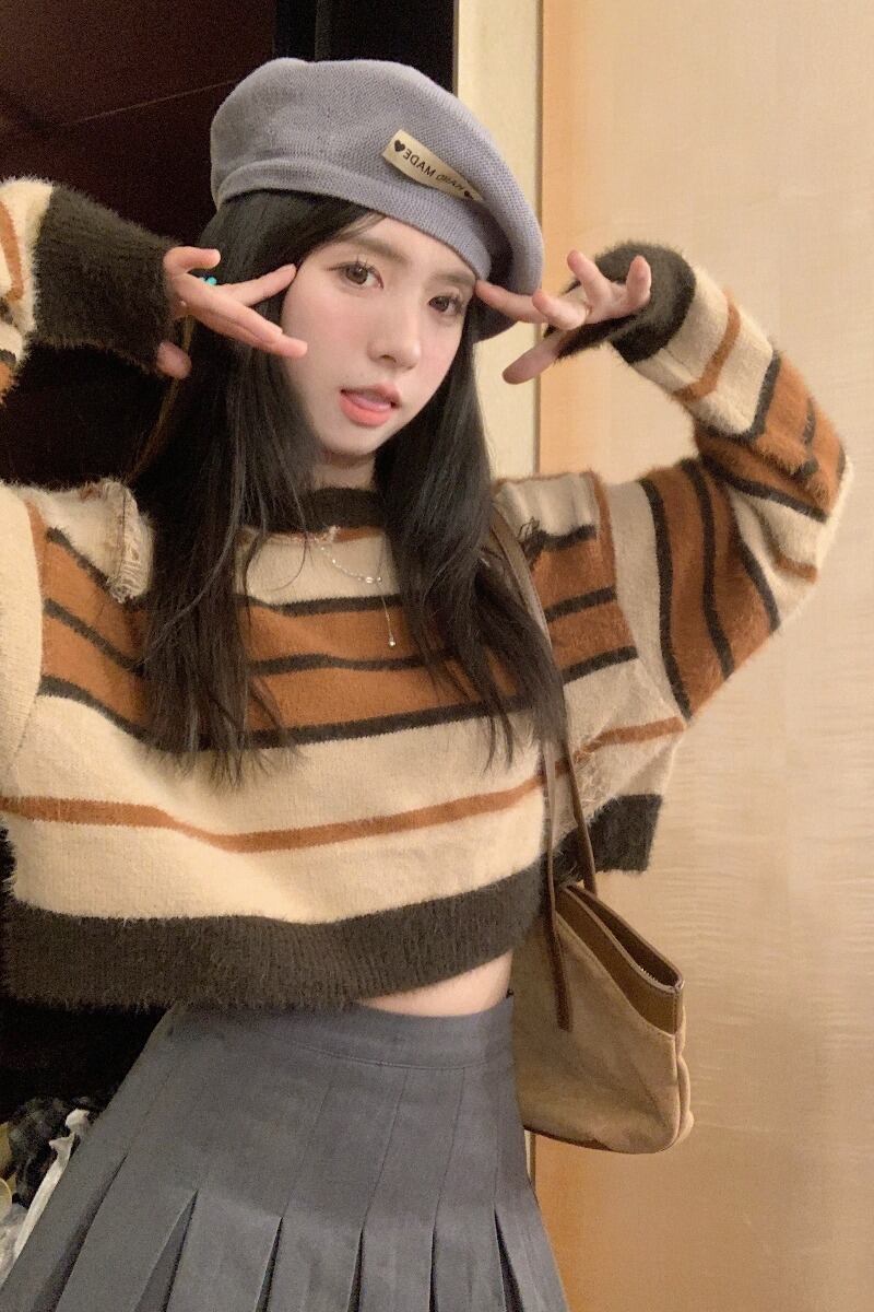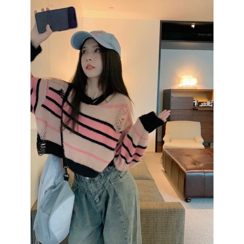 バージョンの怠惰な風が吹くストリートホールストライプショートセーターレディース2023春の新しいシックなオールマッチルーズトップ スプリング 春物 0921955889779468