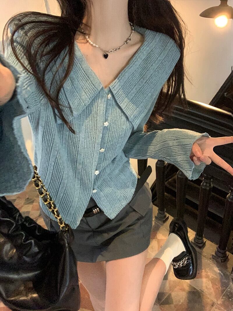 優しい風ブルーの長袖ニットカーディガン女性の 2023 年春の新作スリムフィットと薄いショートボトムトップ ロング スプリング 春物 0921934425123504