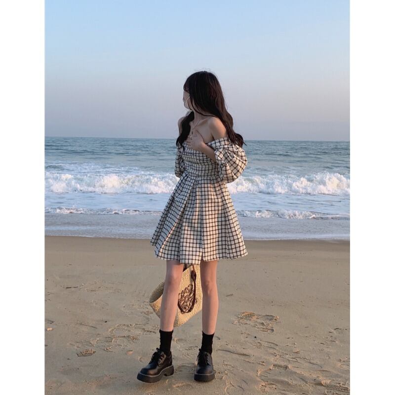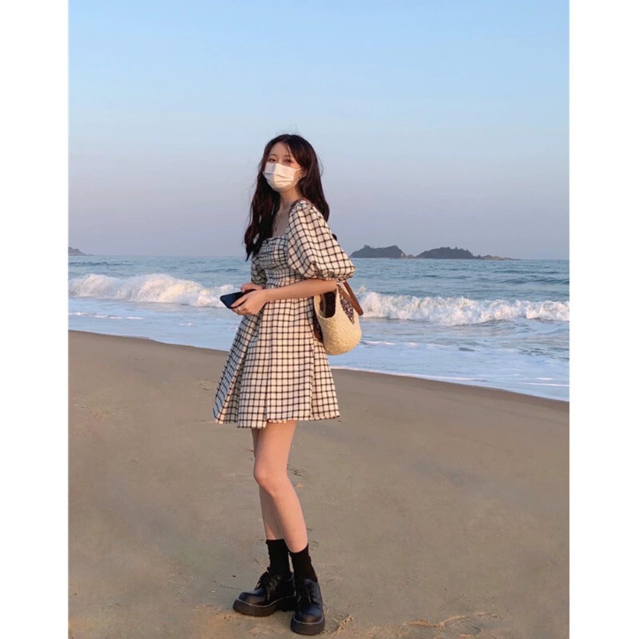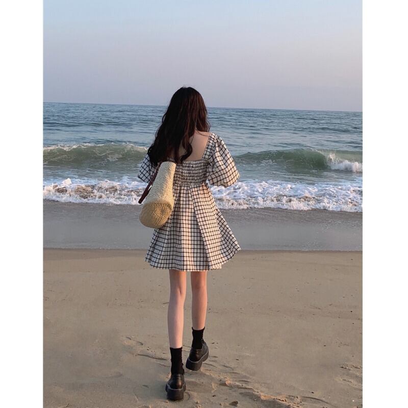 フレンチスタイルの優しいスタイルのスクエアカラーパフスリーブチェック柄ドレスの女性の夏の2023新しいスリムで薄い底スカート サマー 夏物 スクウェア 0921953416295218