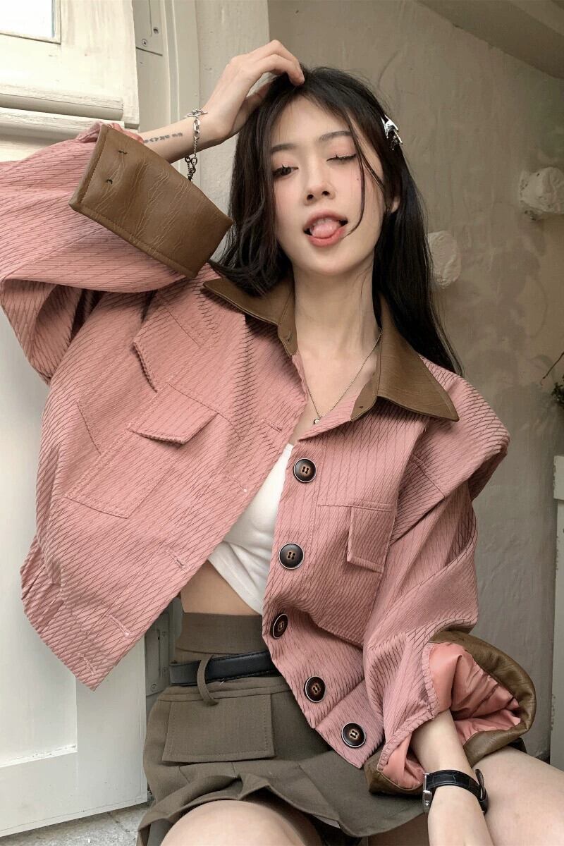 スイート スパイス ガール ラペル ステッチ ショート コート レディース 春 2023 レトロ カラー マッチング PU レザー ジャケット カーディガン トップ 大人ガーリー スウィート キュート カジュアル スプリング 春物 0921983929861574