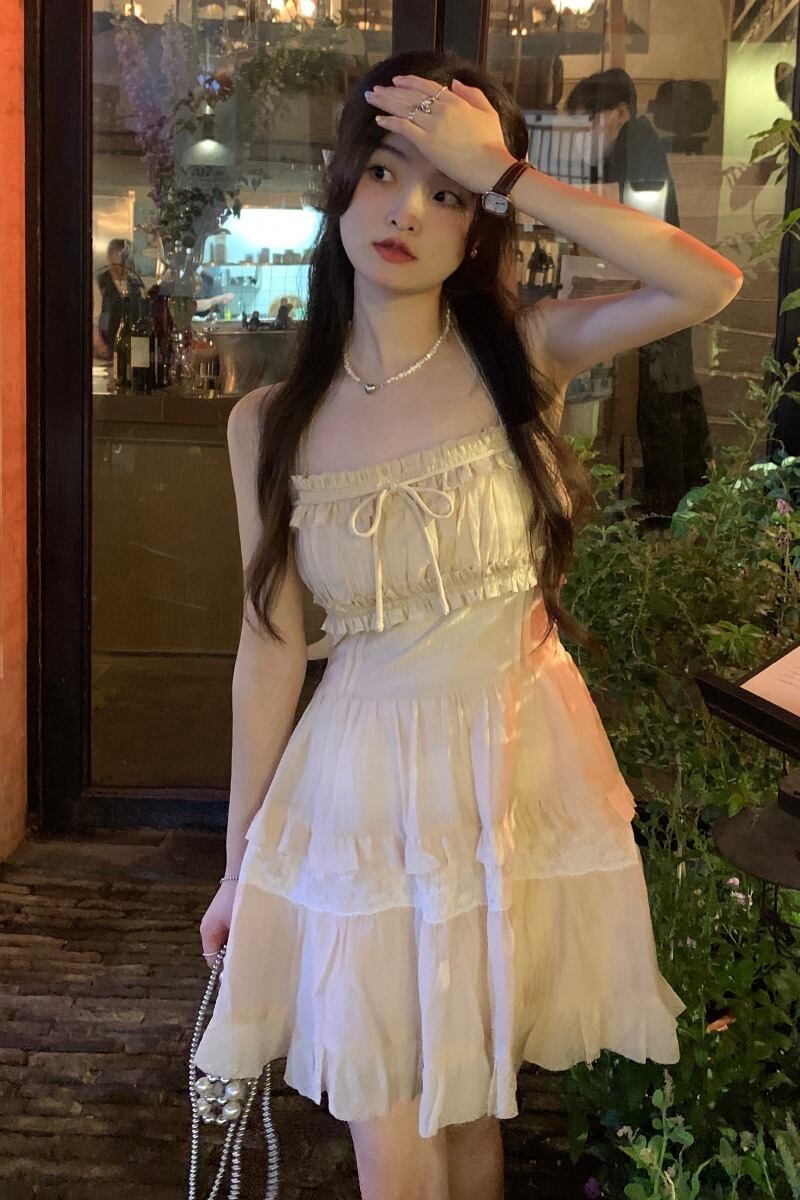 甘い雰囲気のサスペンダースカート女性の夏のフレンチレースステッチドレス純粋な欲望を閉じてウエストと木の耳ショートスカート 大人ガーリー スウィート キュート カジュアル サマー 夏物 ピュア 0921971166072574