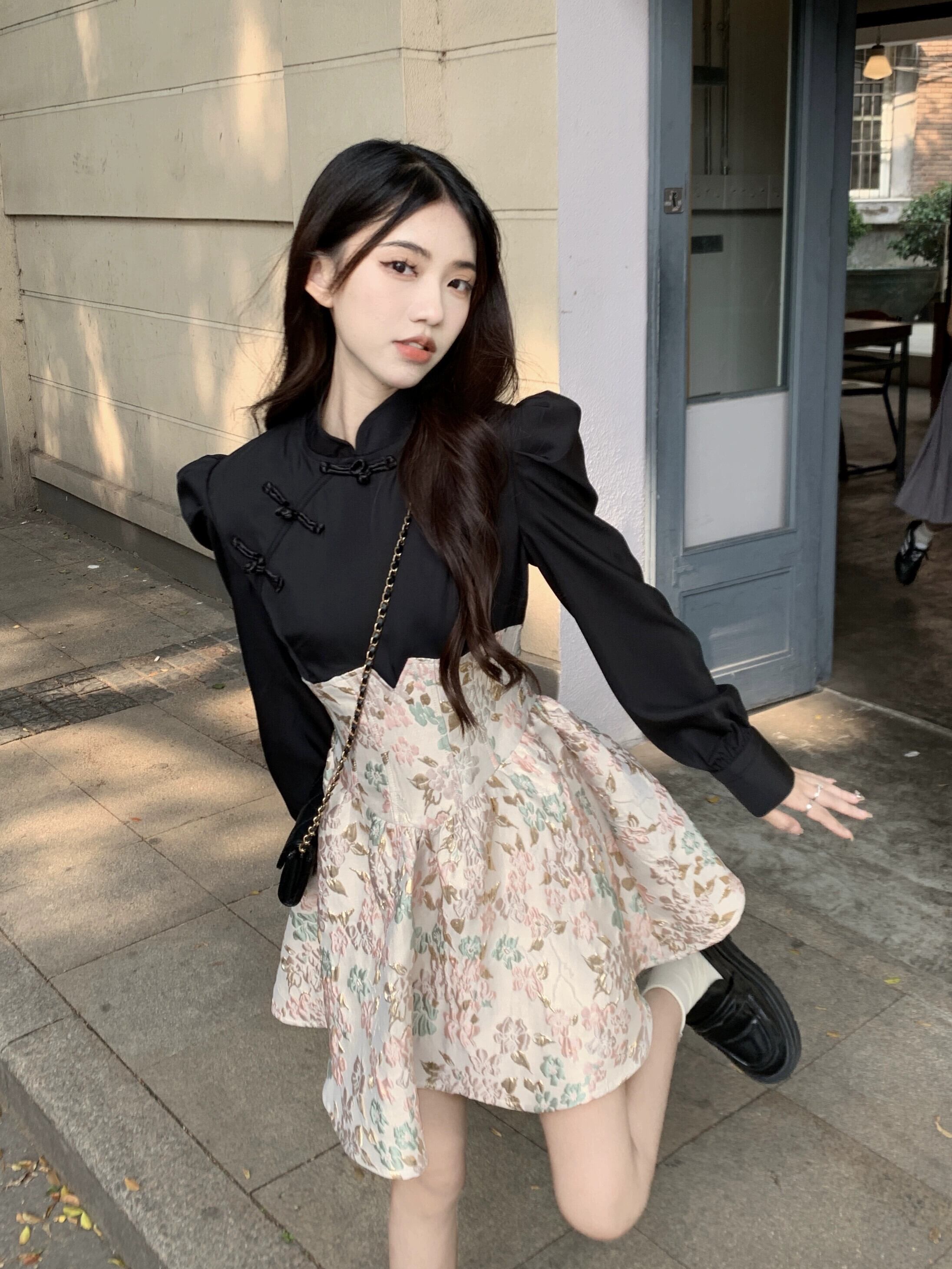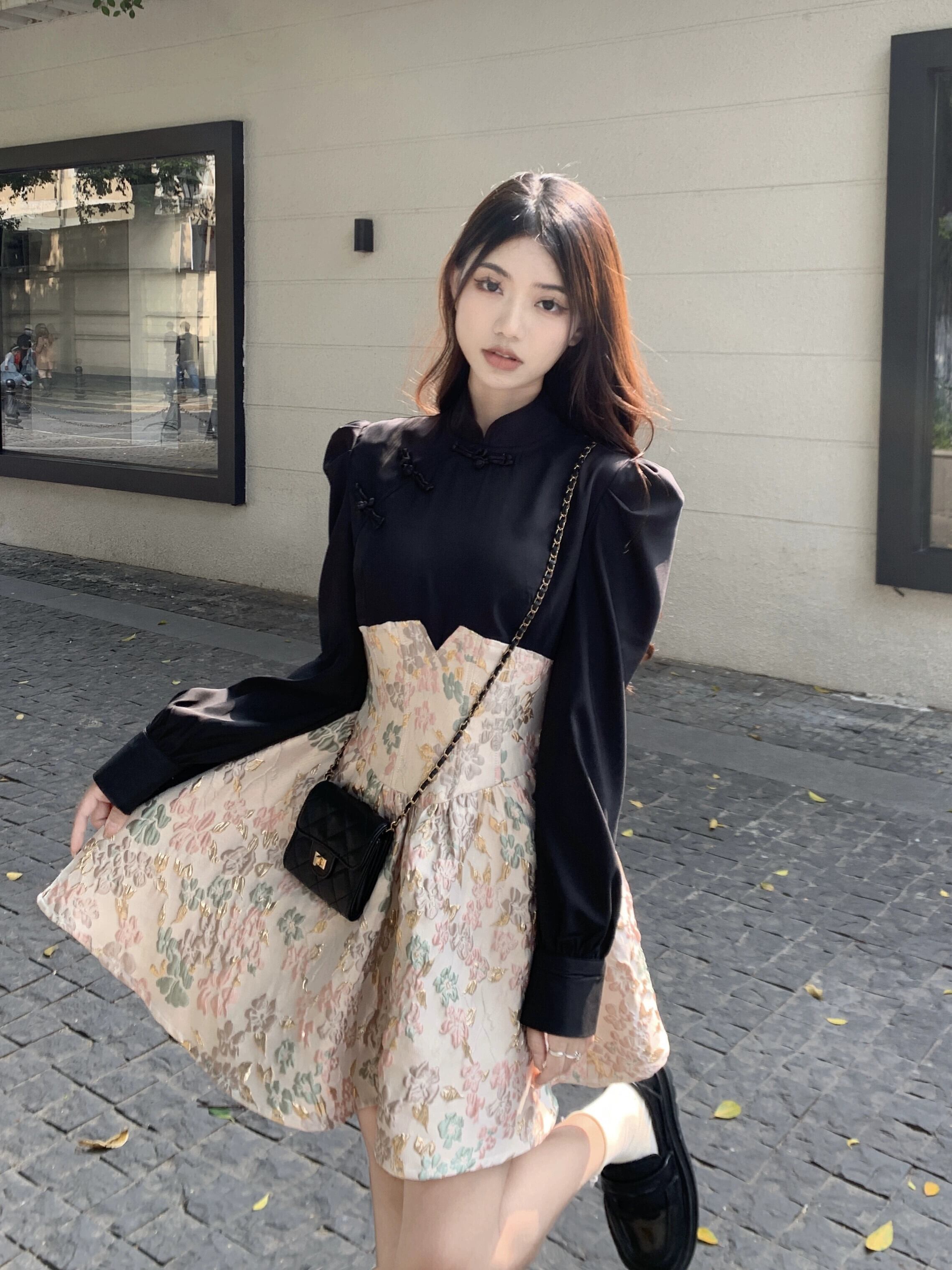 中国風スタンドカラーステッチカラーコントラストドレス女性の夏の 2023 新しい中国風ウエストチャイナスカート サマー 夏物 0921914352465188