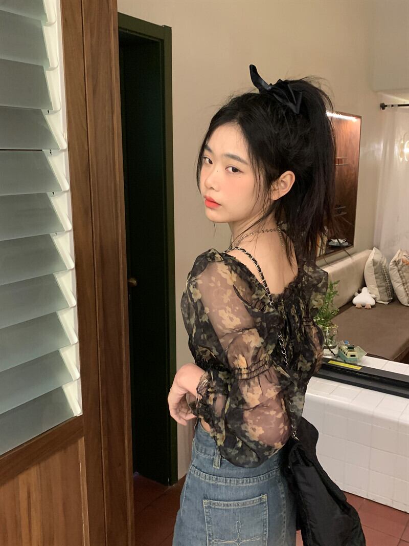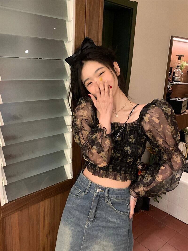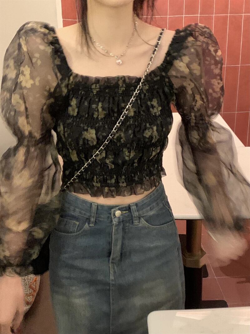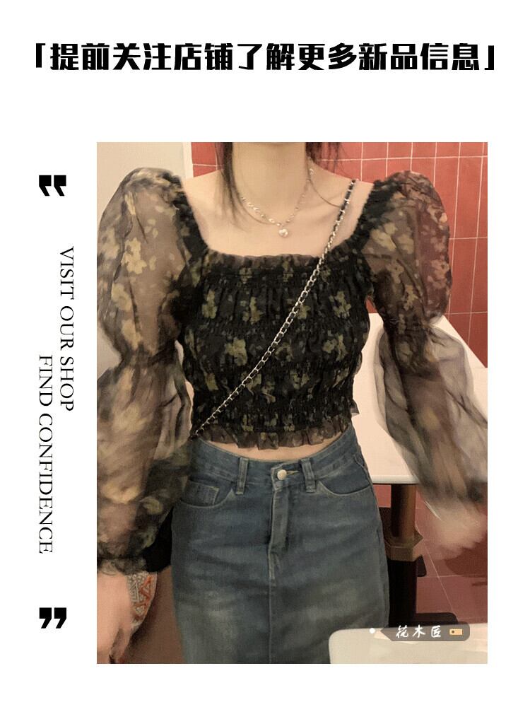 フレンチスクエアカラー花柄パフスリーブシャツ女性の2023春の新作気質ウエスト痩身ショート長袖トップ ロング スプリング 春物 スクウェア 0921952048358088