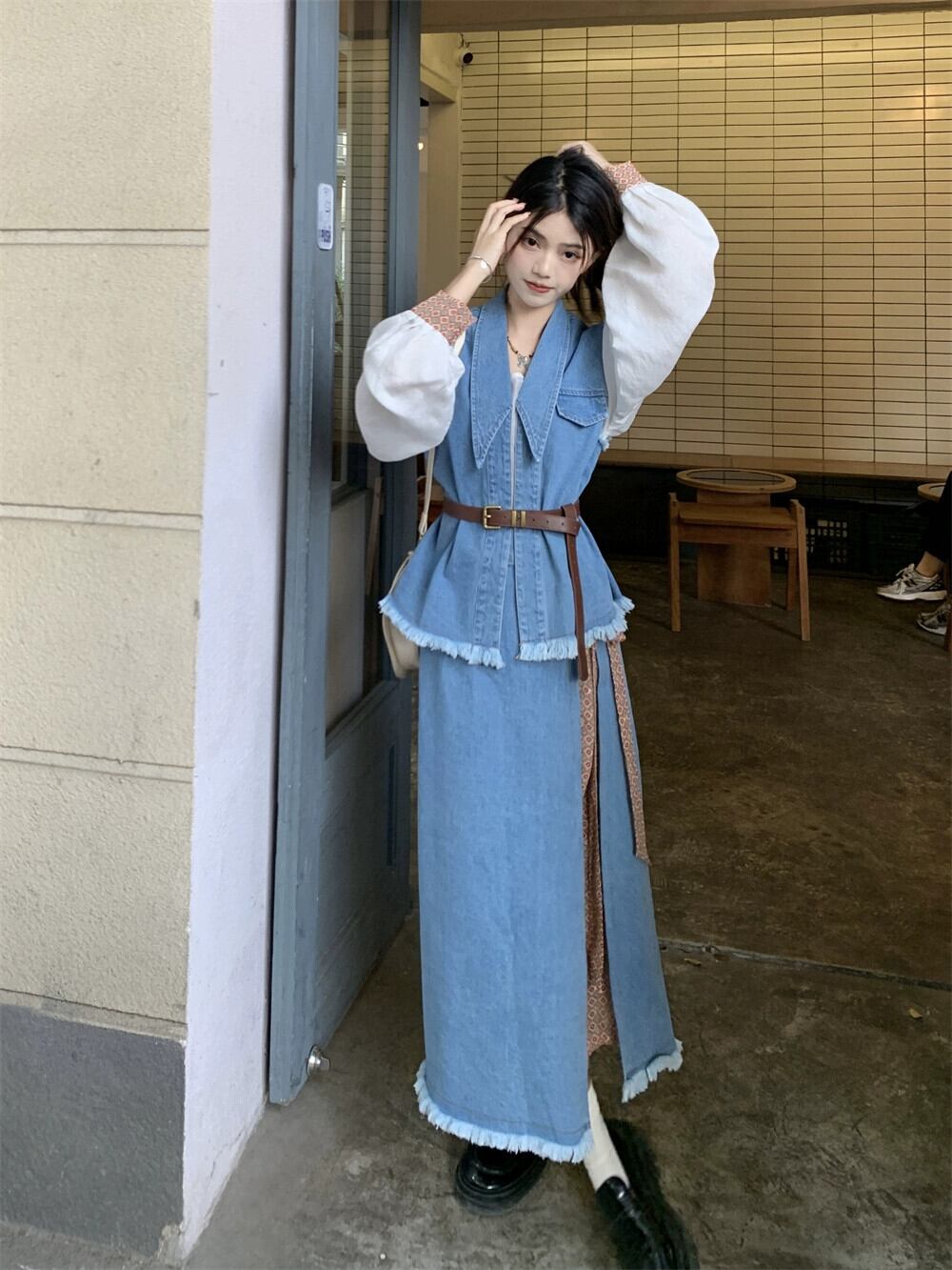 フレンチレトロスーツスカートレディース2023春新作デニムベスト長袖シャツスカートスリーピーストレンディ ロング スプリング 春物 0921911344433131