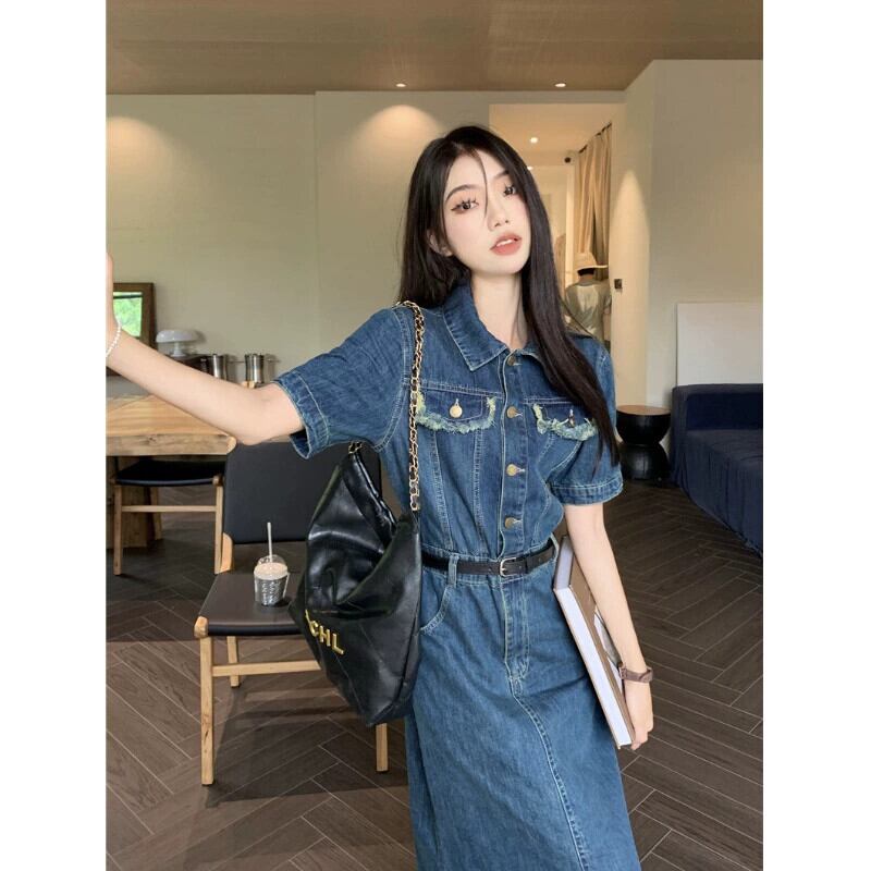 レトロな香港スタイルのデニム半袖ドレスの女性の夏の 2023 新しいスタイルのウエスト痩身アウターウェアミッドレングススカート サマー 夏物 0921947845617021