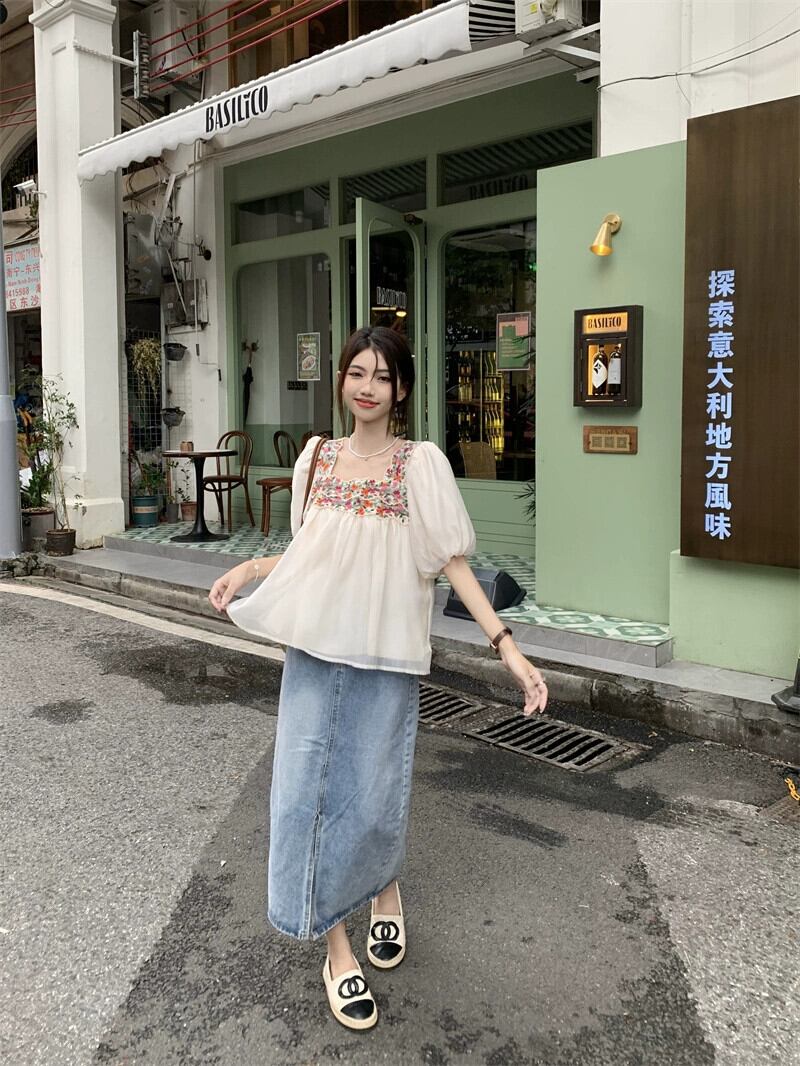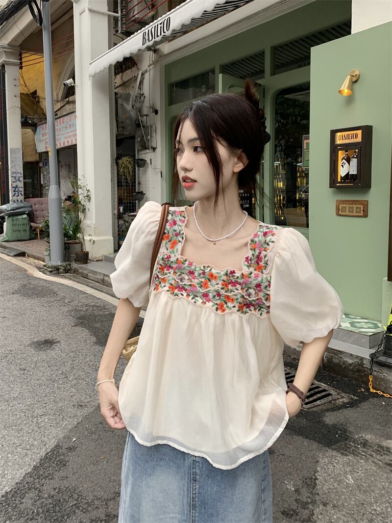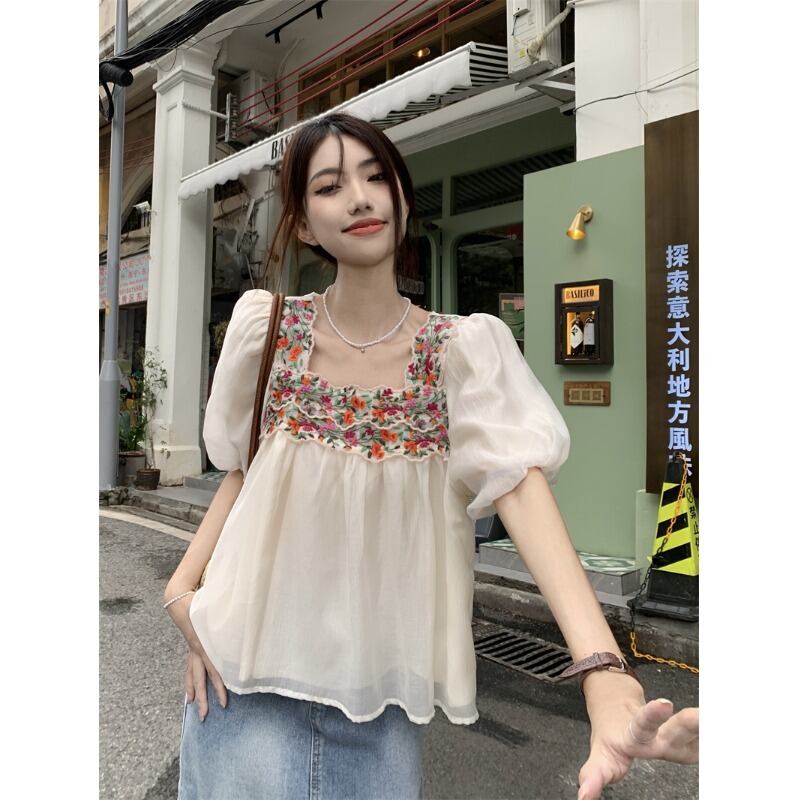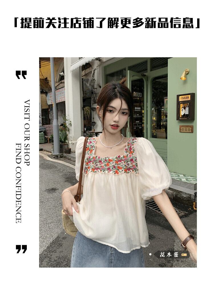 フレンチスクエアカラー刺繍半袖シフォンシャツレディース2023年夏新デザインセンスオールマッチルーズ痩身トップトレンド レッド サマー 夏物 スクウェア 0921995934524163