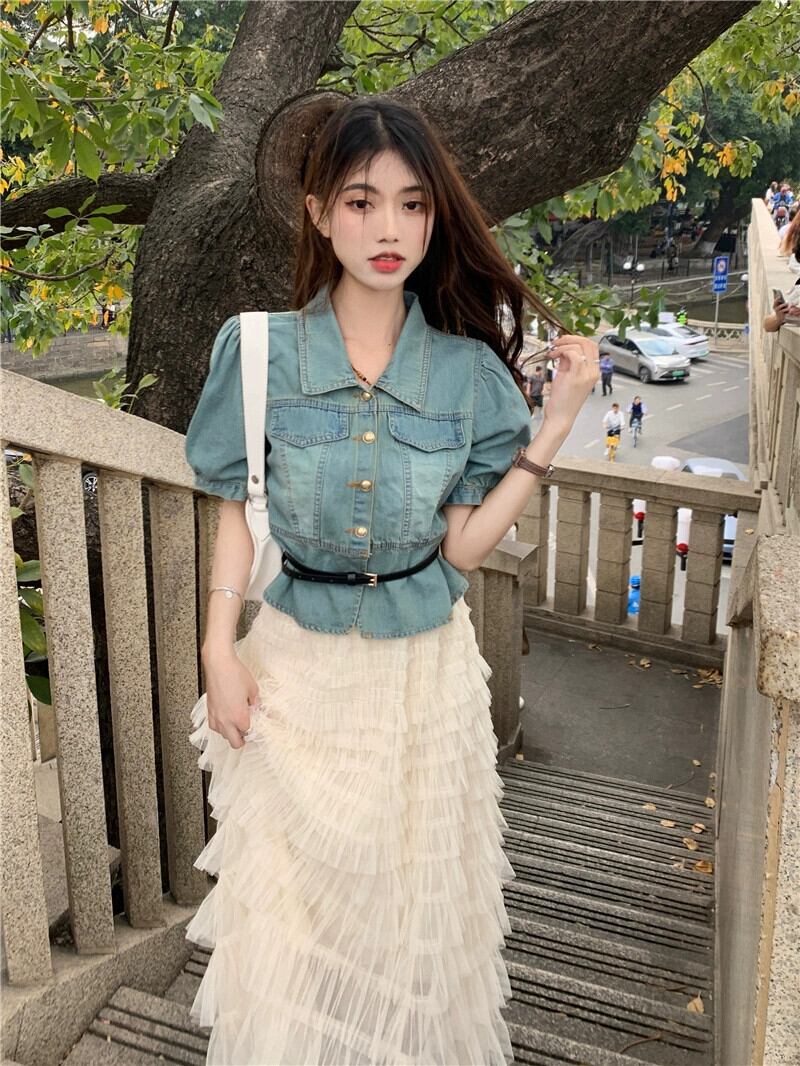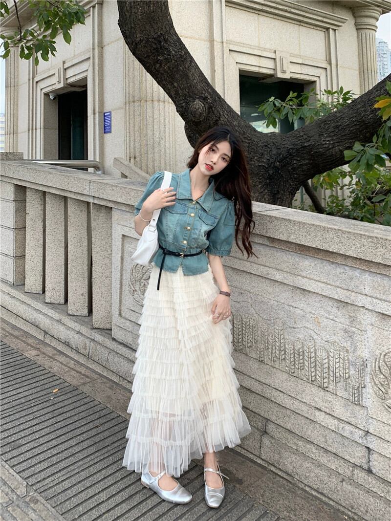 デザインセンススーツレディース 2023 夏の新作半袖デニムジャケット痩身メッシュスカート 2 点セット サマー 夏物 0921999143702705