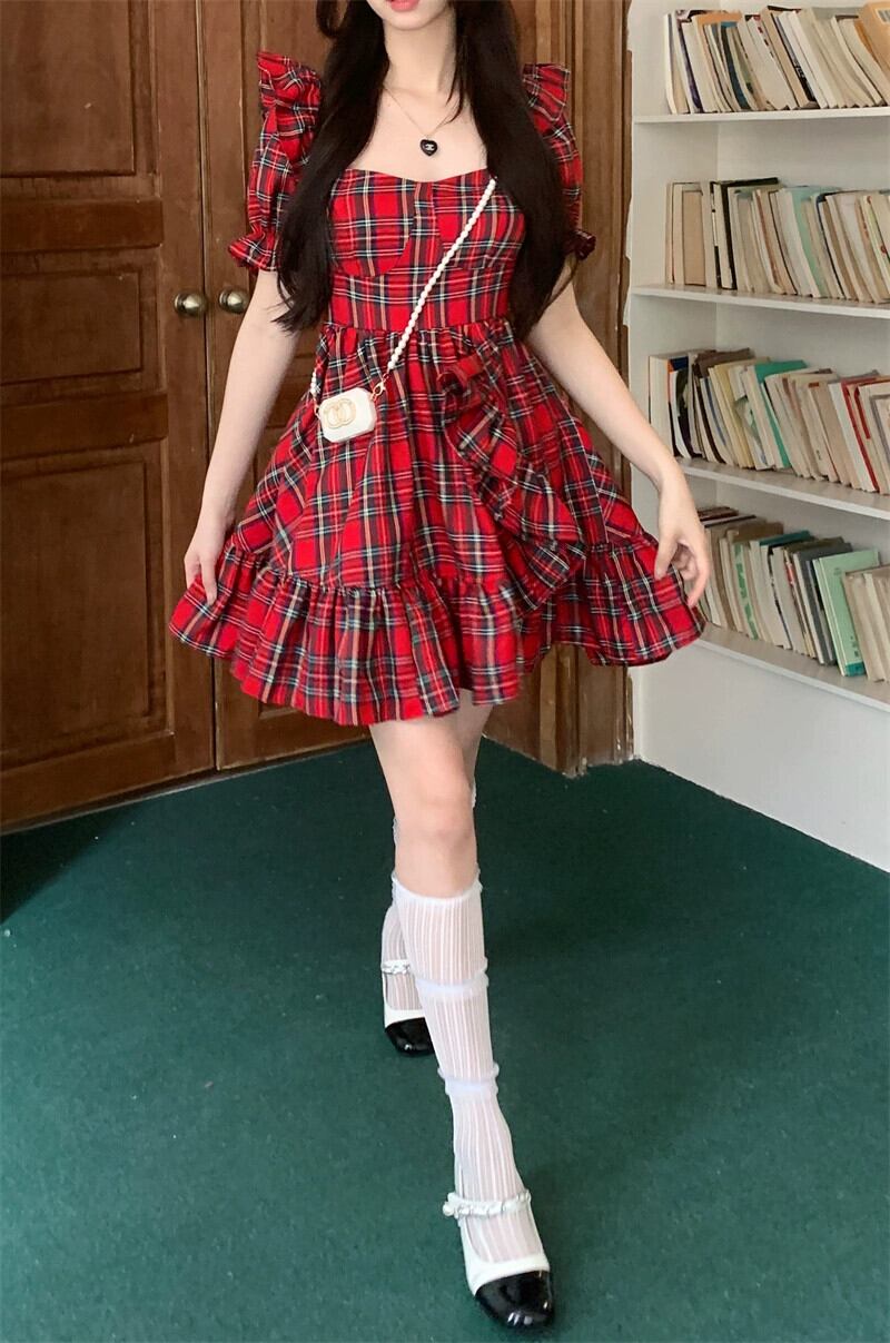 レトロ赤チェック柄パフスリーブドレス女性の夏の 2023 新しい甘いフリルウエスト A ラインスカート レッド 大人ガーリー スウィート キュート カジュアル サマー 夏物 Aライン 0921979313127189