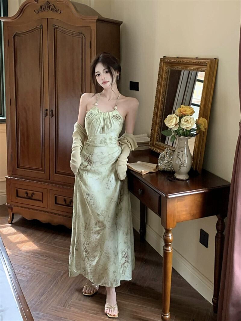 中国風プリントホルターネックドレス女性の夏のセクシーなウエストサスペンダースカートハイエンド気質ミッドレングススカート サマー 夏物 092194506945772