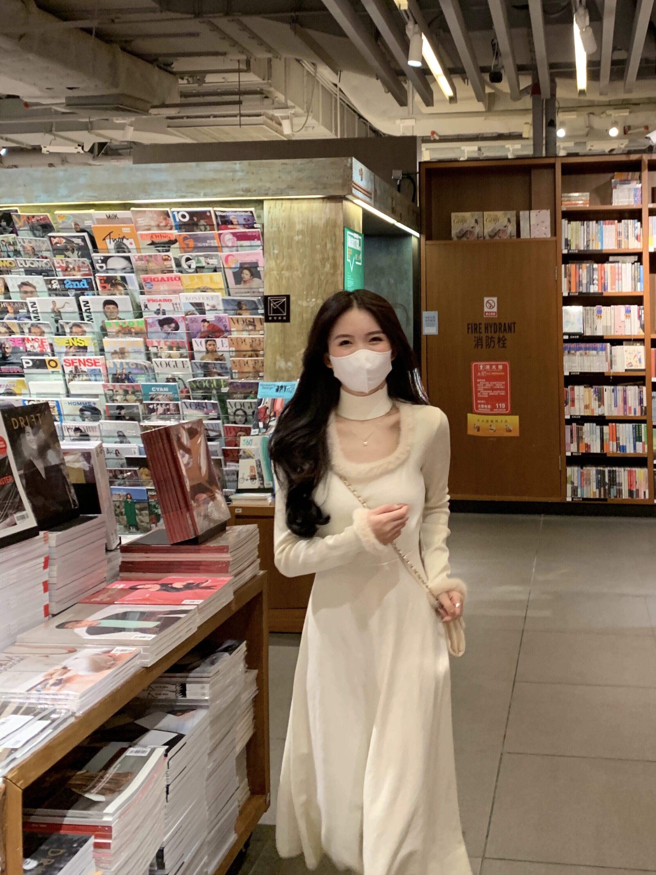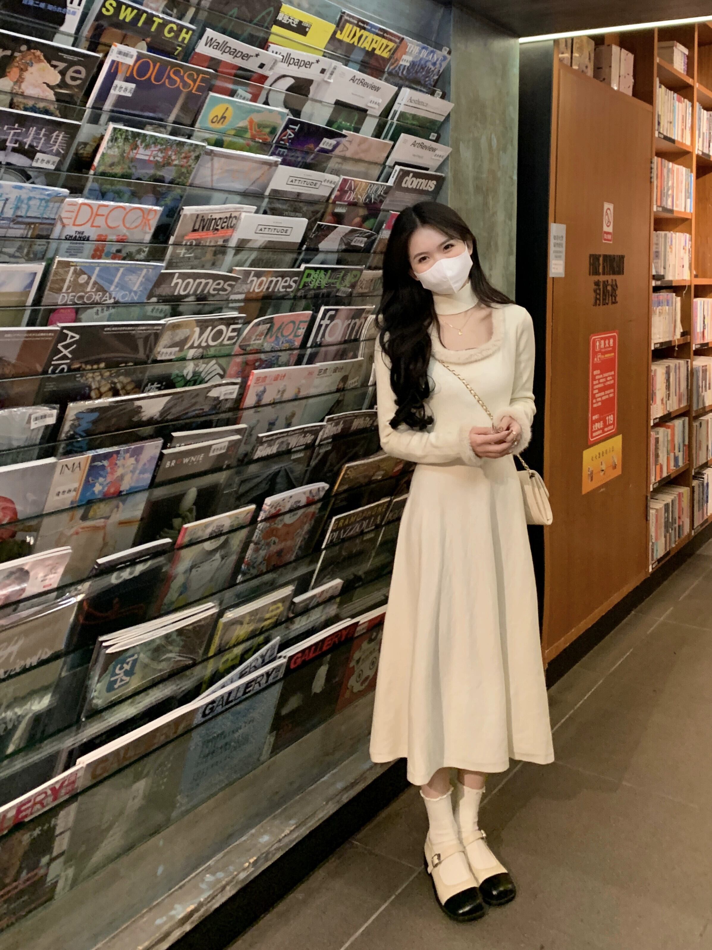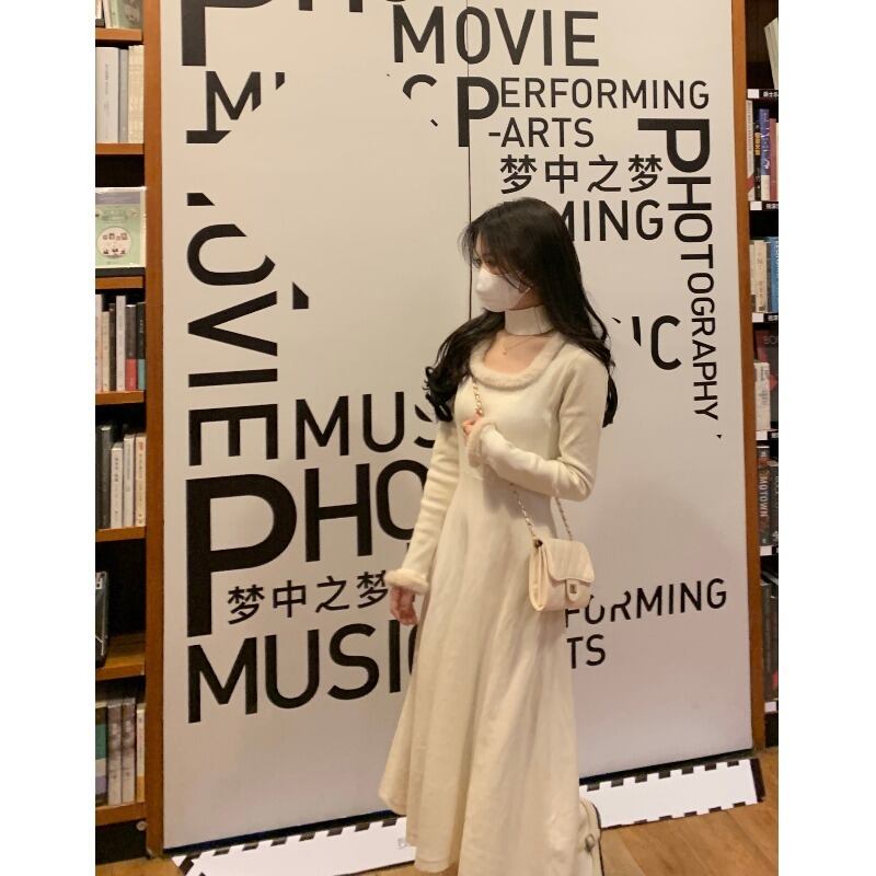 フランスのレトロな優しいスタイルの長袖ドレスの女性の 2023 春と秋の新しいスプライシング気質スクエアカラーミドル丈スカート ロング スプリング 春物 オータム 秋物 スクウェア 0921928080688592