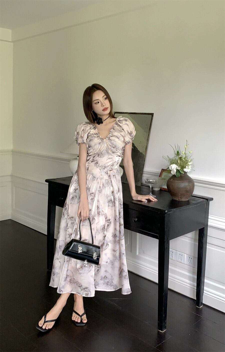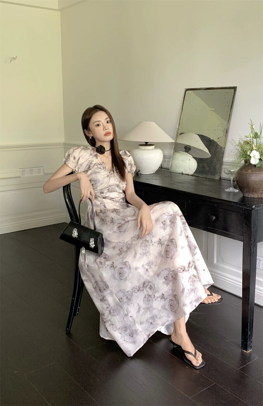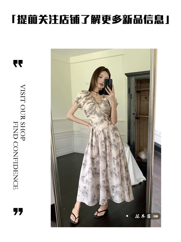 フレンチティーブレイクフラワーVネックパフスリーブドレスレディース2023年夏新しい気質スリムスリムミドル丈スカート サマー 夏物 フラワーデザイン 0921966956935600